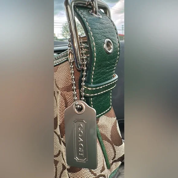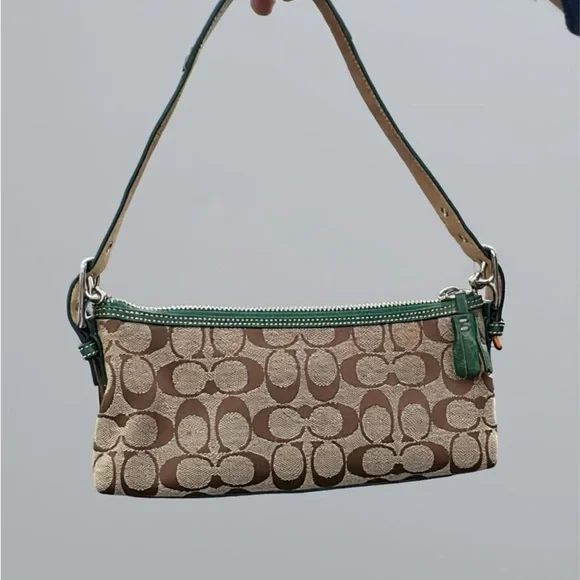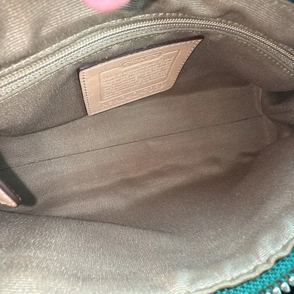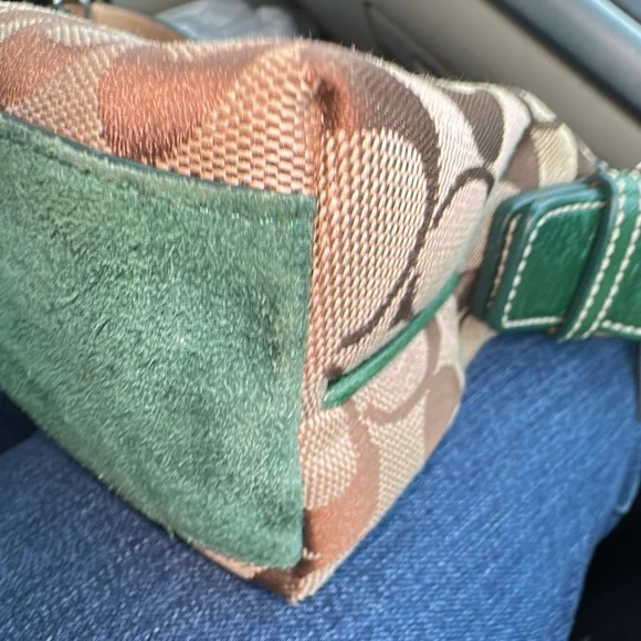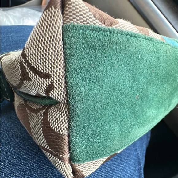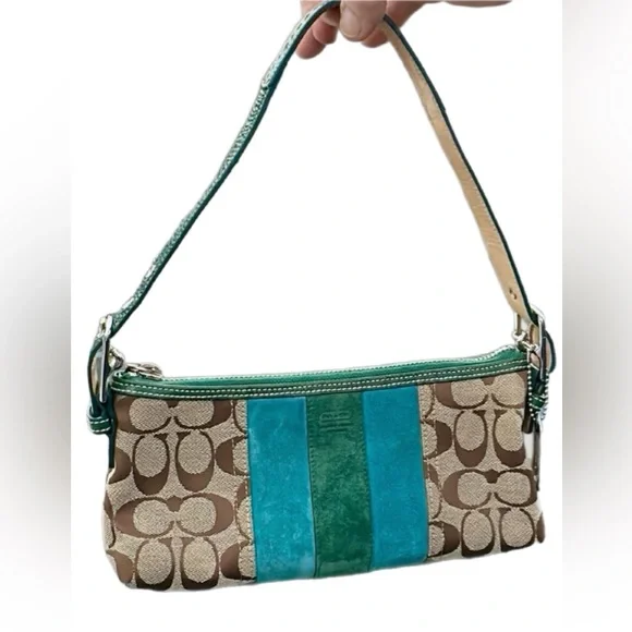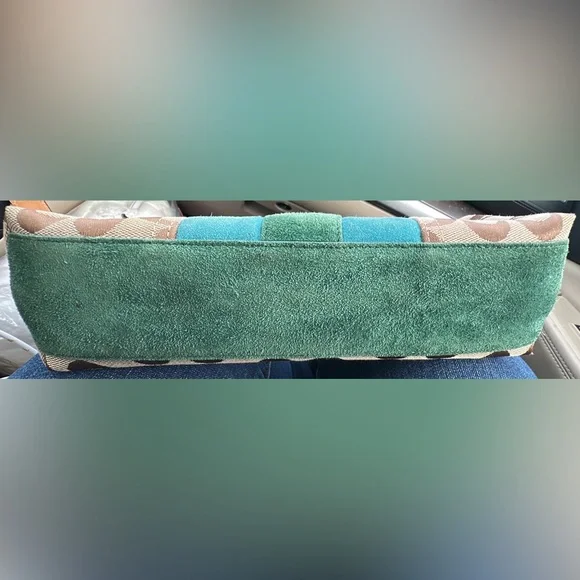 Vintage Coach Demi bag green and blue suede and canvas.Excellent Condition - Bottom and corners in great shape!Features silver-tone hardware, original Coach hangtag a single adjustable green leather shoulder strap. Has top zipper closure with a green tassle. Interior of handbag is with a single side zipper pocketApprox: 10 × 5 x 3inExcellent pre-owned condition, see pictures for full description.THIS COLOR IS A RARE FIND! Questions? Leave a comment below!