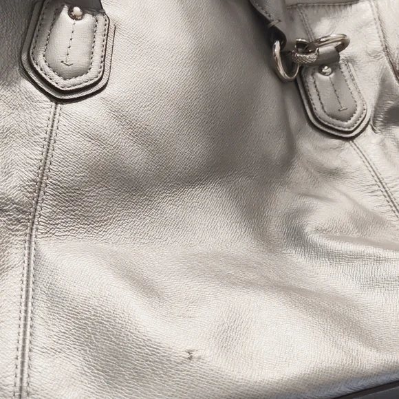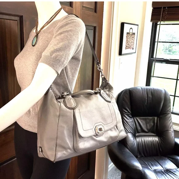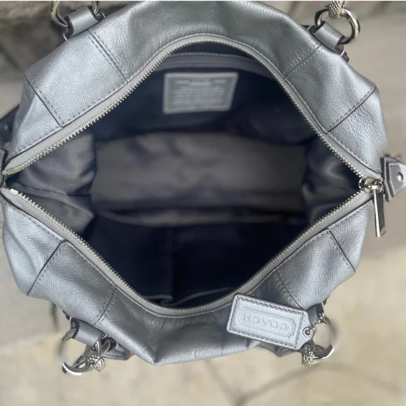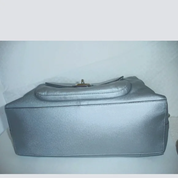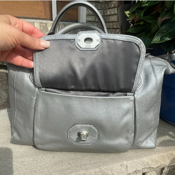 Questions? Leave a comment below!very good conditionsoft leathersilver color* small blemish on leather from use- see last pic- hardly noticeableclean liningØStyle: H1320-F25508ØCoach Campbell Turn-Lock Large Patent Leather Satchel Tote Hang Bag Shoulder BagØColor: Platinum SilverØPolished Silver tone hardwareØTwo inside Multifunction’s Slip PocketsØOne inside Zippered pocketØZip top closure with Coach engraved silver pullØCoach emboss original leather hang tagØCoach silver/gray center turn key chainØInterior solid gray liningØInterior leather patch engraved with Coach Creed and Serial numberØSize: 13 3/4 (L)x8 3/4(H)x5 3/4(D)ØDual Leather Drop 5 1/4” (Approx.)ØDetachable5.5” shoulder strap Drop 9.5”