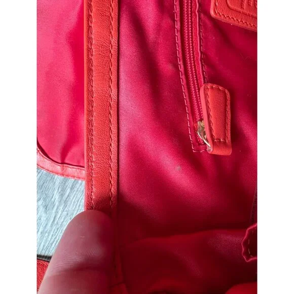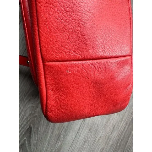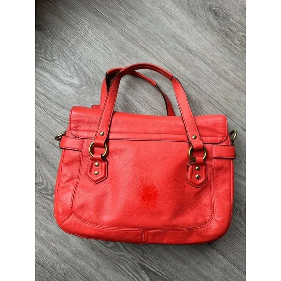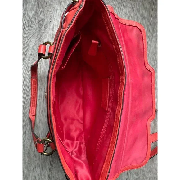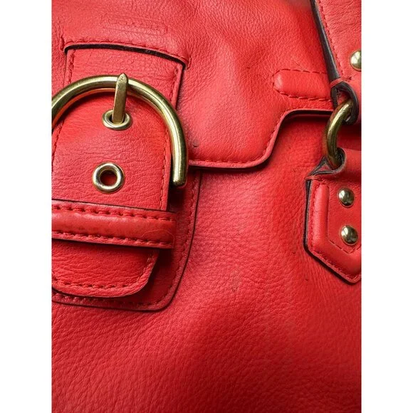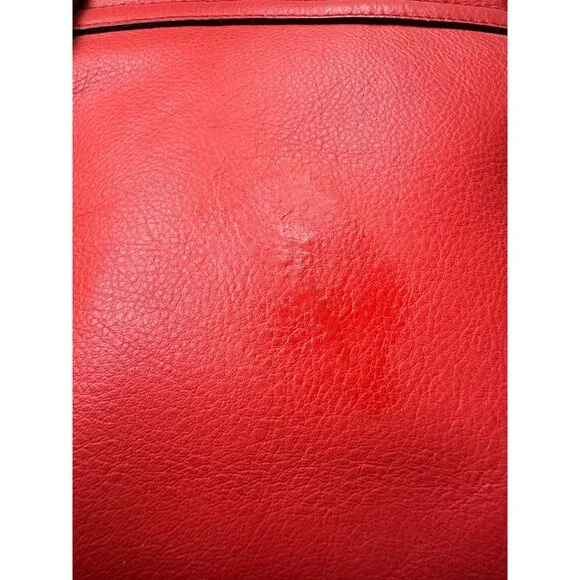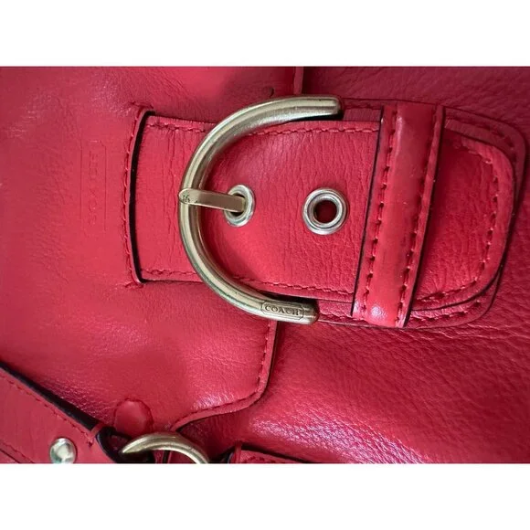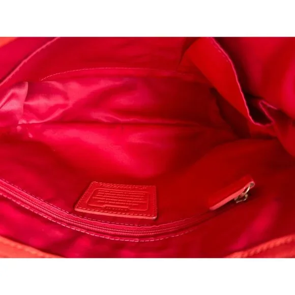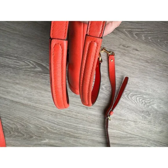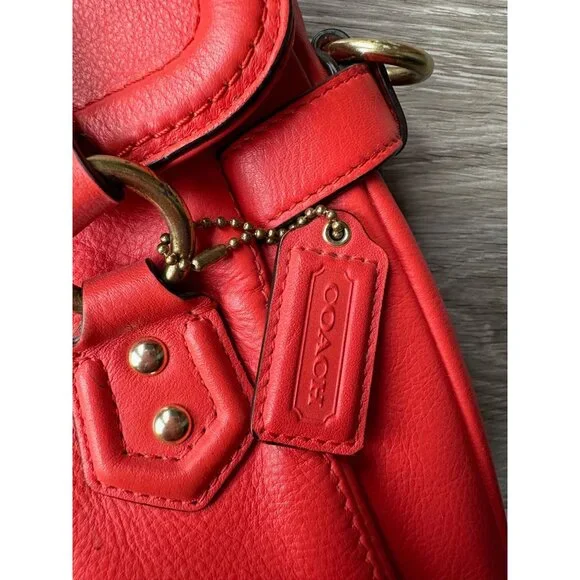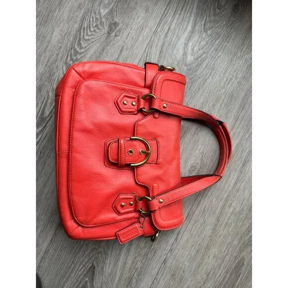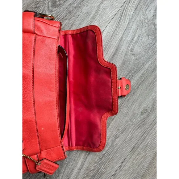 Bright and fiery beautiful deep orange / red Coach Bag. Large buckle (magnetic snap) on the front flap . Zip closure main compartment. Carry as 2 handle satchel or attached the Included long strap to carry as shoulder or crossbody. Includes Coach tag shown.Faint to see 1-2" area on back of bag that seems to have a coating or been treated with something. Very minor spots near buckle that should wash off easily. Small ink spot on interior. Some wear to rings of hardwarebut you have to look closely to see.See photos for best depictions of all. Callouts are very minor, it is an overall great looking bag!Approx:11" Wide7.5" Tall3.5" Deep4" Strap drop for satchel handles