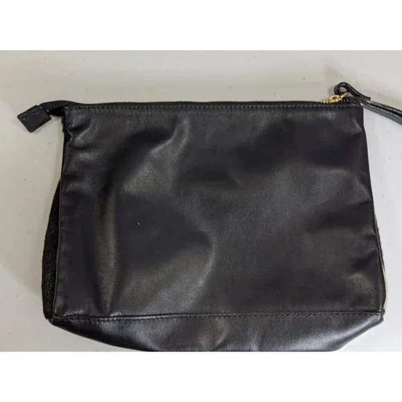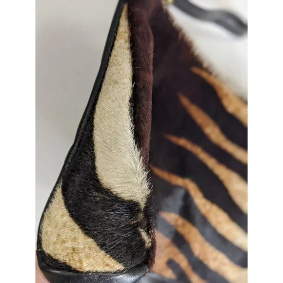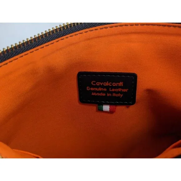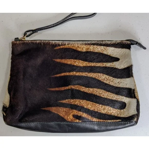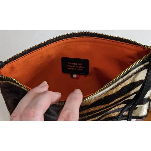 Cavalcanti leather black and orange zebra fur clutch.7 x 11 x 2.5 inches.6.5 inch strap.Luxurious leather black and orange zebra fur clutch by Cavalcanti. It´s made from genuine leather, and the front and sides have a fur exterior made to look like black/white/orange zebra stripes. The back and bottom are plain black and don´t have fur. It has a top zipper closure, and a 6.5 inch wrist strap. The inside is a large open pocket, lined with orange fabric. It has an emblem sewn in that says "Cavalcanti - Genuine Leather - Made In Italy". This is a super unique designer bag, and it´s in amazing condition! Be the talk of the town with this safari-like design!
