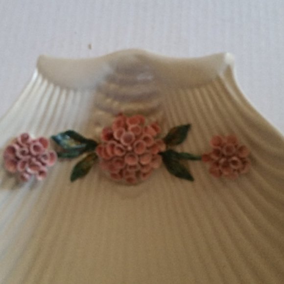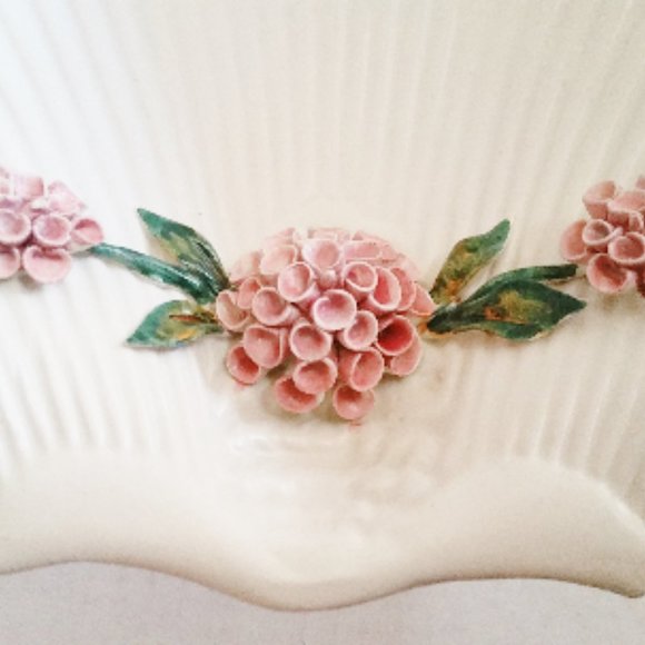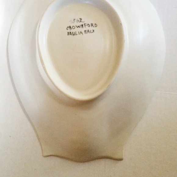 Vintage SHELL BOWL Italian Crownford Dahlia Large 13" Scalloped Majolica Flower Details Matte White Finish DeepLightly glazed near matte finish ceramic pottery bowl.Excellent Condition -Small chip on green leafupper left at 11:00 o´clock.Gorgeous large- 13" Long x 11" (Widest Point) x 3.5" HighFooted bowl is nice and wide, quite deep, solid and heavy.Lovely pink & green Majolica type flower details at one end.- Marked "CROWNFORD DAHLIA ITALY1862" on the bottom.1940s/1950s