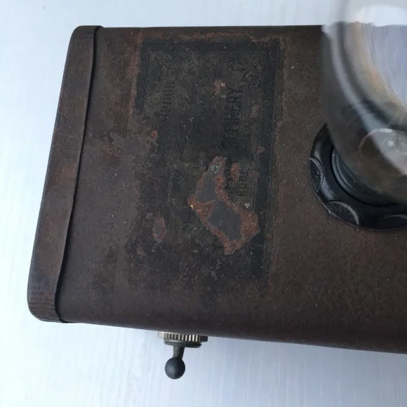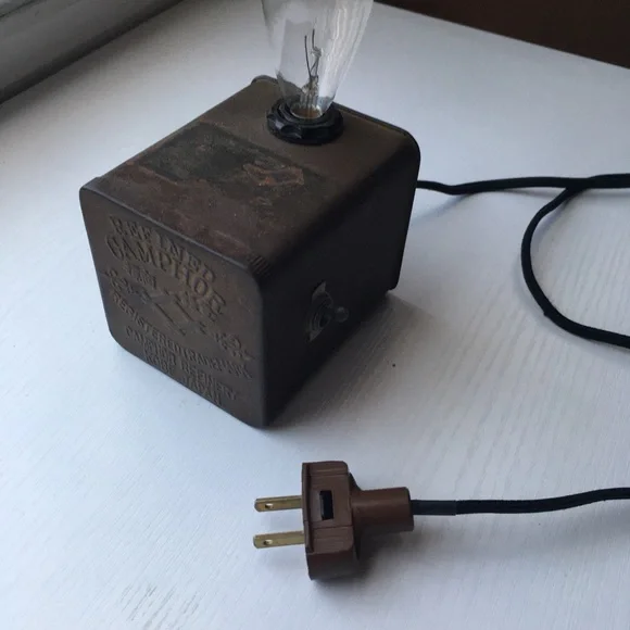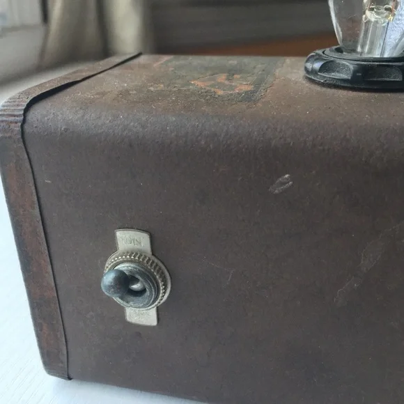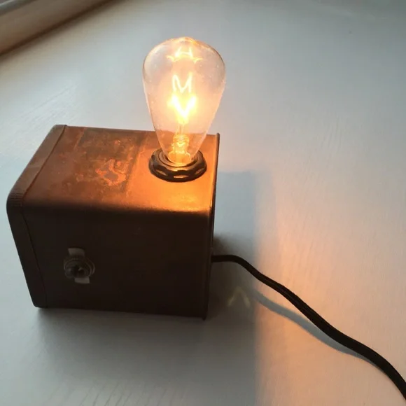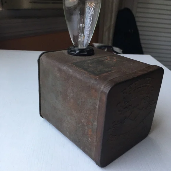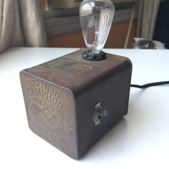 This is a one of a kind antique vintage metal lamp with switch flip. It is a reconstructed metal tin with embossed writing of Refined Camphor Camphor Refinery Kobe Japan. Because the metal tin is antique there is some discoloration but overall it is smooth, no sharp spots on the metal. You are able to open the tin and inside is the wiring for the lamp. Rectangular shape Measurements:3.75” length3” width3” heightThis will come without a light bulb. Light bulb is for display only.