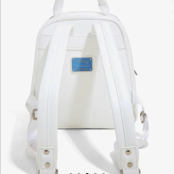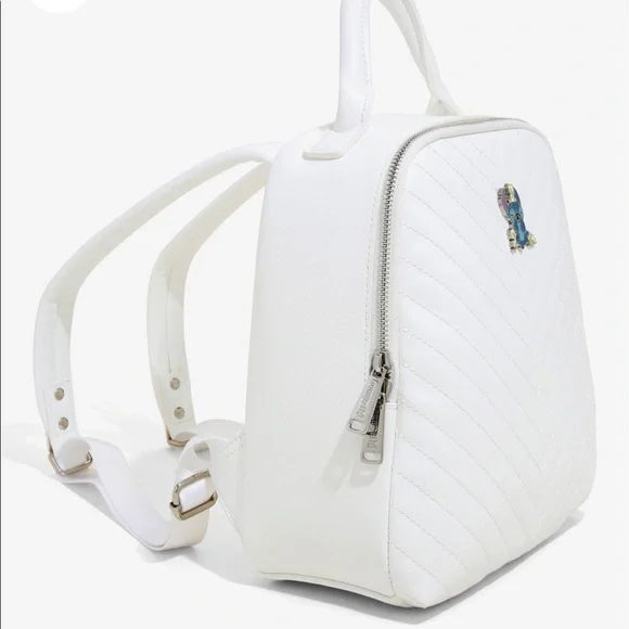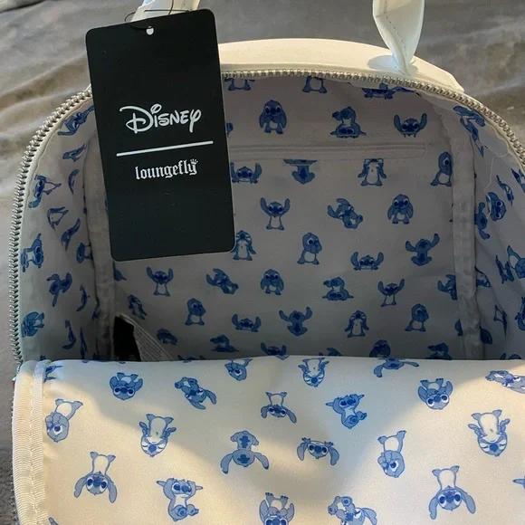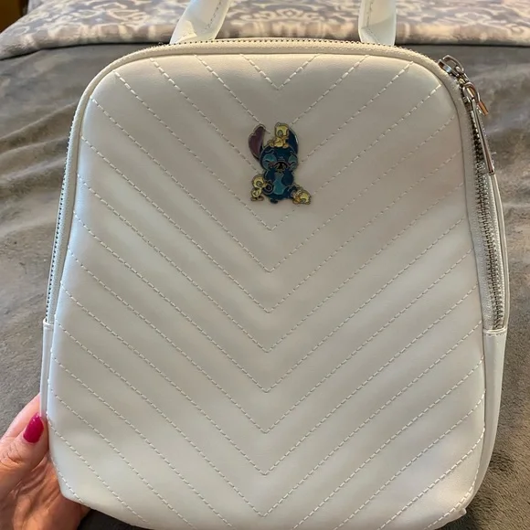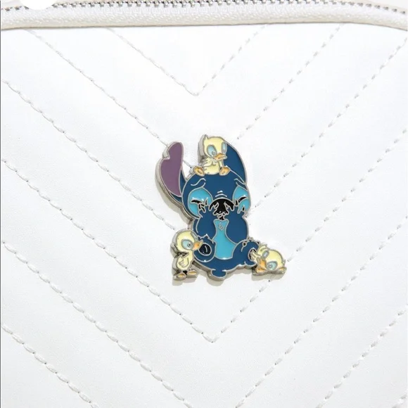 NWT Loungefly mini backpack featuring Disney’s Stitch and his duckling friends on a classy white quilted background. Adjustable straps, zipper closure, inside zipper pocket,...