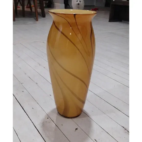 Large vintage Swirled Glass Yellow with Brown Vase, Retro