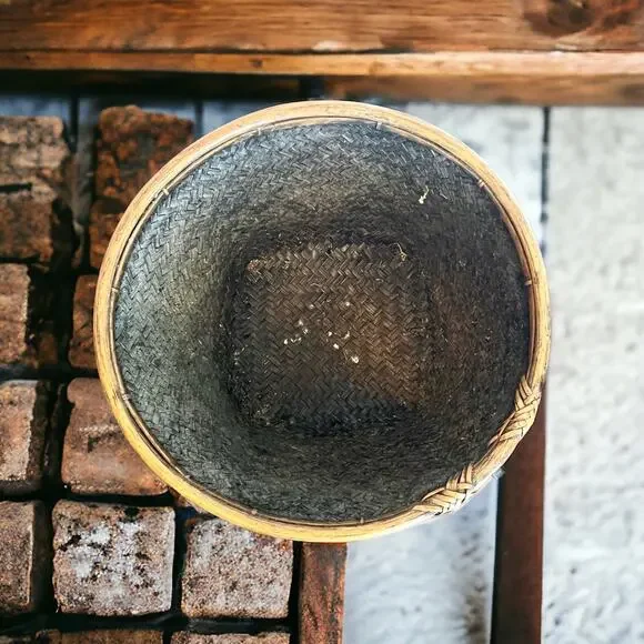 Rattan & Bamboo Basket Planter-Vintage Asian Hand-Woven-Wood Stand-Boho-Storage