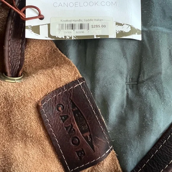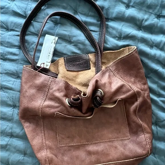Absolutely stunning Canoe Italian leather and cowhide bag.Brand new with tags – originally $285.Knotted handle and saddle-style body.Statement piece!