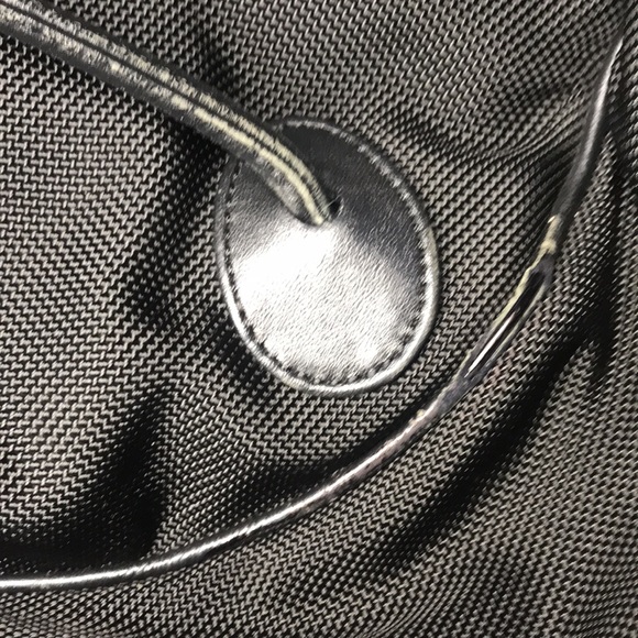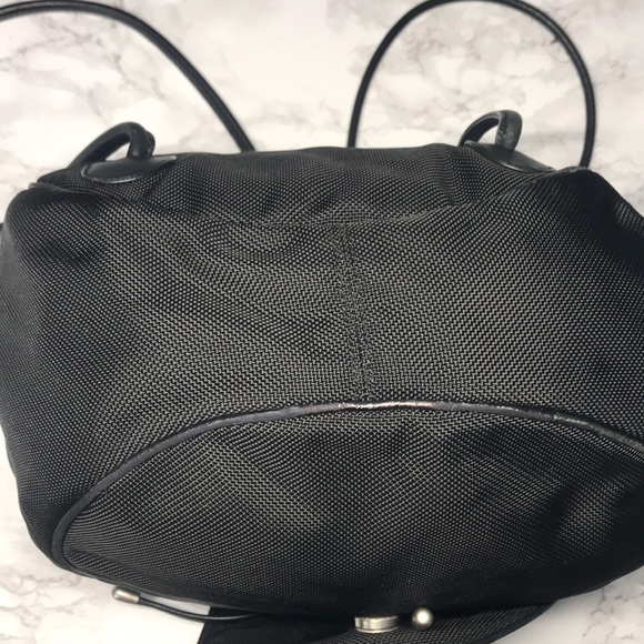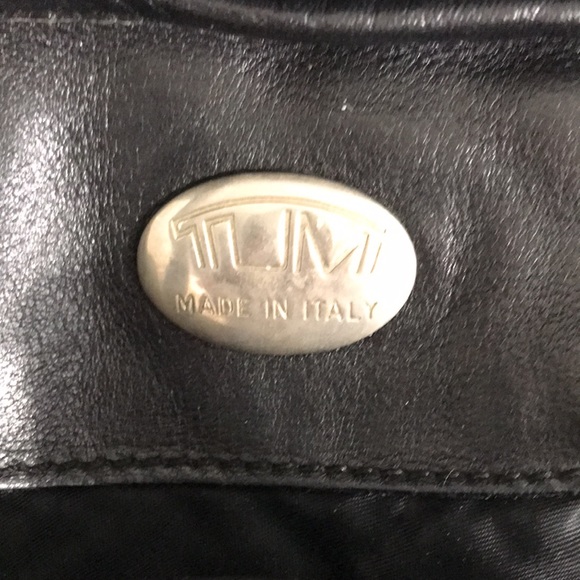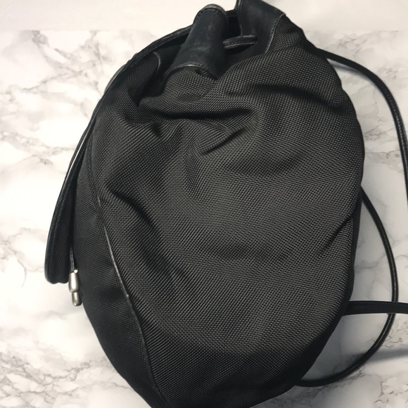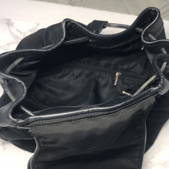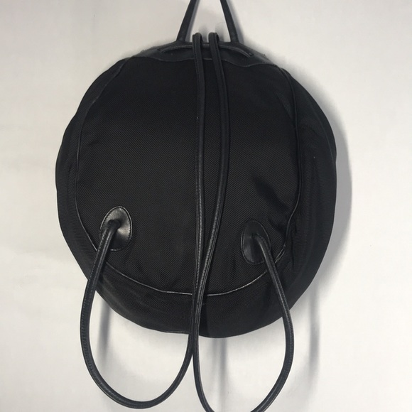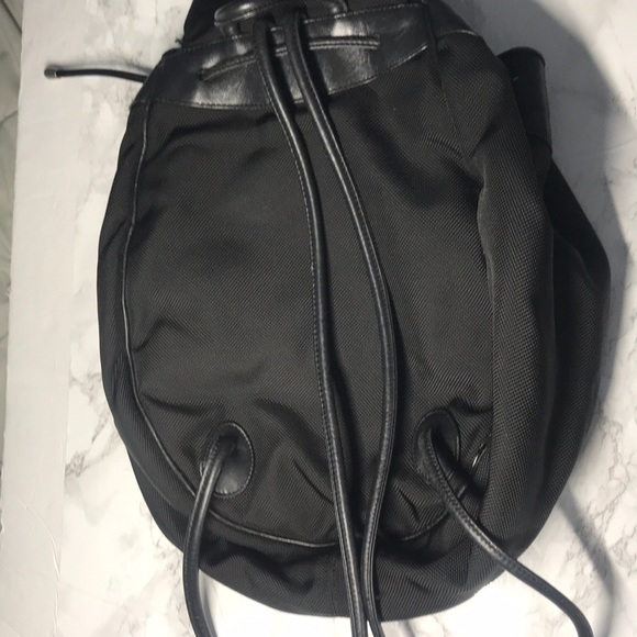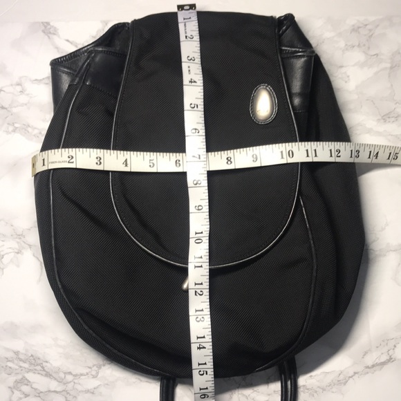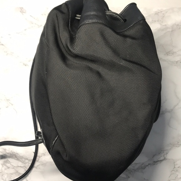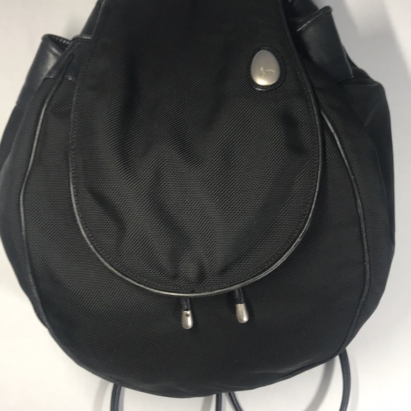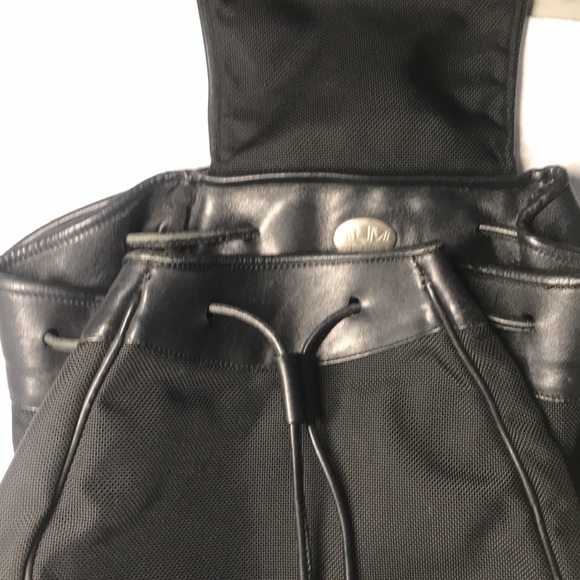 Vintage TUMI Nylon Knit with Leather Accent Oval Backpack PurseVintage early 1990s, Made in ItalySolid black with signature TUMI silvertone hardware, has skinny leather backpack shoulder straps (fixed length, non-adjustable), circular drawstring with leather bolo-pinch and metal tips, and large foldover flap closure (magnetic snap) over main compartment.Black fabric lining (no material tag to indicate fabric type).Interior features several sidewall zippered pockets, key lanyard, and an ID window.Please check out all photos for condition of this bag.While the body of the bag is in very good condition and all hardware/closure/straps are fully functional, please note in last 2 close-up photos that leather piping along edges of bag has minor cracking and evidence of wear in some places. and that interior ID window has what looks to be permanent rust stains.Please see approx flatlay measurements in photos, approx 16" high x 13" wide x 6" depth when unfilled.Please ask any questions prior to purchase.Ships same or next business day from smokefree, petfree home.Bundle for discount/shipping savings.