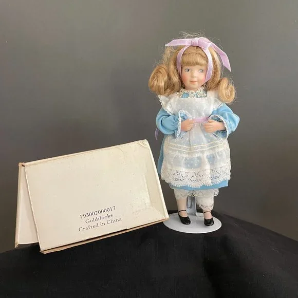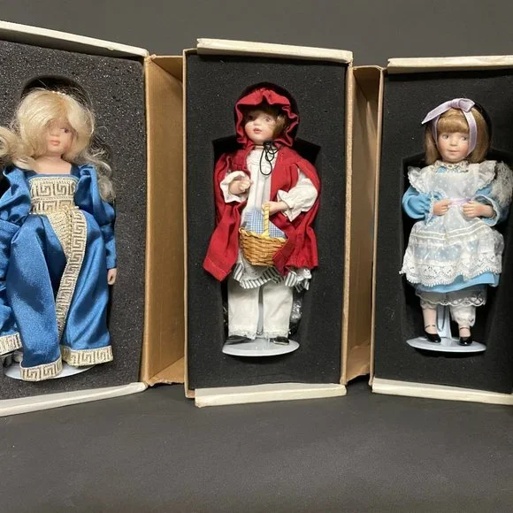 Danbury Mint Set Of 4 Porcelain Dolls From the Story Book Collection -With Stands ---- Condition is Used, but in a great condition. Appear to be Only displayed, never played with. Beautiful porcelain dolls measure 8 inches tall. Includes: Cinderella, Little Red Riding Hood,Alice in Wonderland, Goldilocks.Acquired at an Auction DID NOT Come from a SMOKE FREE HOME.The Boxes has residual odor but can be cleaned.Dolls are in Excellent condition and appear to have been maintained in a case.THESE ARE SOLD AS IS and as a SET.