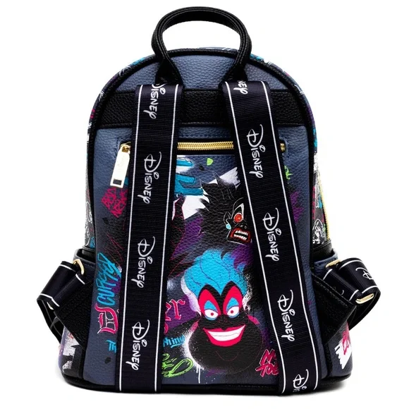 Step into the world of Disney´s dark side with our enchantingly edgy Disney Villains Pop Art Mini Backpack! Crafted from soft vegan black leather, this mini backpack is both stylish and cruelty-free. Featuring iconic villains like The Evil Queen, Maleficent, and Ursula, surrounded by playful skulls and stars motifs in vibrant pop art form, it´s a must-have accessory for any Disney fan with an appreciation for the darker characters.But the fun doesn´t stop there! On the side pockets and back of the backpack, you´ll find even more notorious villains making an appearance, including Hades from Hercules, Jafar from Aladdin, and Captain Hook from Peter Pan. And with a practical extra zipper compartment, you´ll have plenty of space to store all your essentials while on the go.Product Features:• Dimensions: 11"H x 8.5"W x 4"D: Front Pocket Measures - 6 1/2"W x 4 1/4"H x 1"D• Materials: High quality vegan leather• Pockets & Closures: Main compartment Disney logo zipper, small zipper pocket inside, one front magnet pocket, two side drop pockets for fast and easy access to akeys, and other essentials.• Details: Features Disney Princess gold tone finished hardware that adds a touch of elegance.• Adjustable strapsEmbrace your inner Disney villain with this eye-catching LIMITED EDITION backpack that seamlessly blends style and fandom. Whether you´re headed to the theme parks or just out for a day of adventure, make a statement with our Disney Villains Pop Art Mini Backpack."