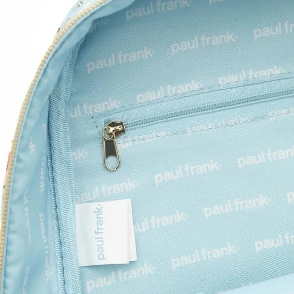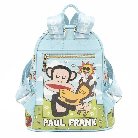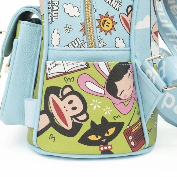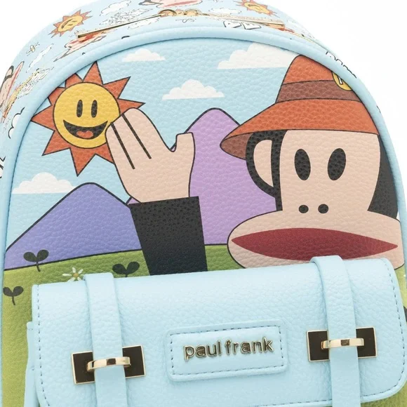 NWT Oficial Licensed ProductIntroducing the Paul Frank Backpack, a delightful blend of style, functionality, and sustainability. Crafted from luxurious vegan pebble leather in serene sky blue tones, this 11" backpack is not only fashionable but also eco-conscious.Featuring iconic characters from Planned Pines, including Julius and his pals, this backpack is a playful homage to the beloved Paul Frank universe. The front pocket boasts a magnetic closure adorned with a die-cut edge "Paul Frank" badge, adding a touch of whimsy to your daily adventures.With gold zipper pulls and multiple pockets, including a convenient zipper pocket on the back, organizing your essentials has never been easier. The front showcases Julius and friends, including the lovable "Worry Bear" and Mika the Cat, while the back reveals a heartwarming scene of Julius and Clancy basking under the sun.But the charm doesn´t stop there—side pockets feature Juliusrelaxed and cheerful, perfect for stashing small items or displaying yourtrading pin collection with the durable fabric straps, subtly branded with the "Paul Frank" logo.Embrace style, functionality, and sustainability with the Paul Frank Backpack—your perfect companion for everyday adventures.