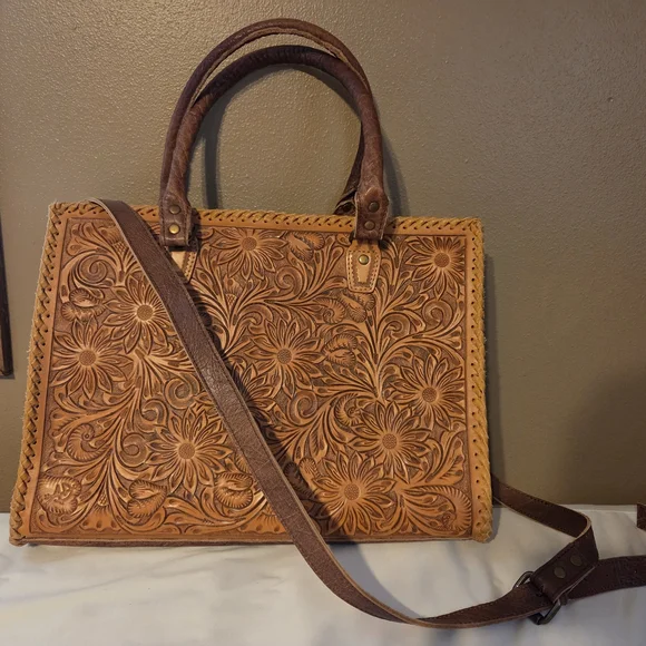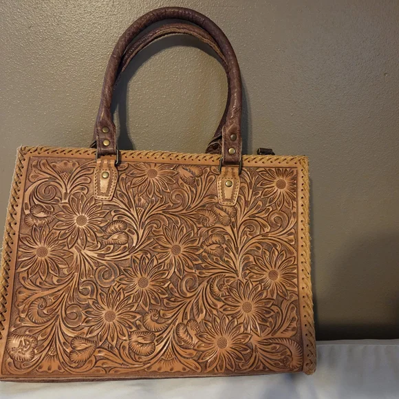 Experience the artistry of American Darling with this exquisite tan and brown leather tote. Crafted with intricate tooled leather work, this bag showcases a stunning floral and scroll pattern that exudes sophistication. The sturdy leather handles and medium-sized design make it a perfect blend of style and practicality for any occasion.