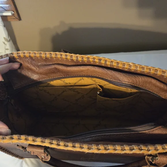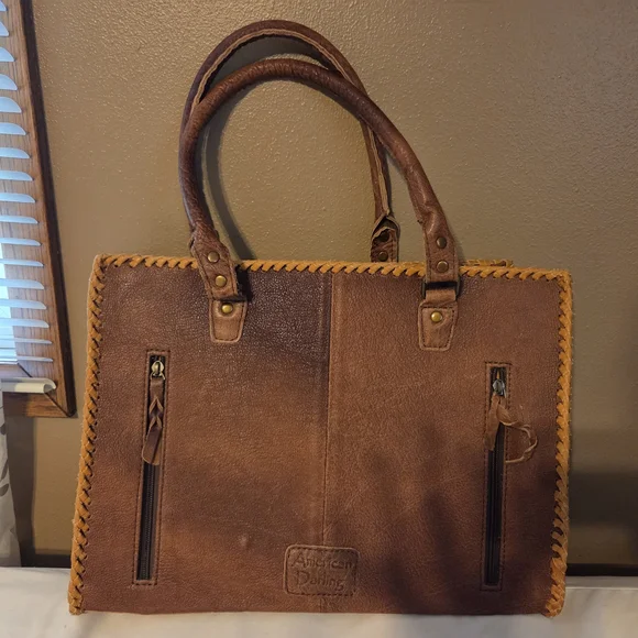 Experience the artistry of American Darling with this exquisite tan and brown leather tote. Crafted with intricate tooled leather work, this bag showcases a stunning floral and...
