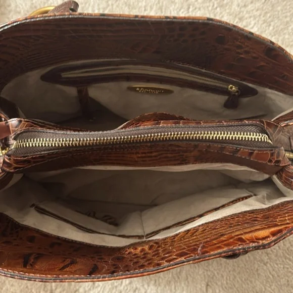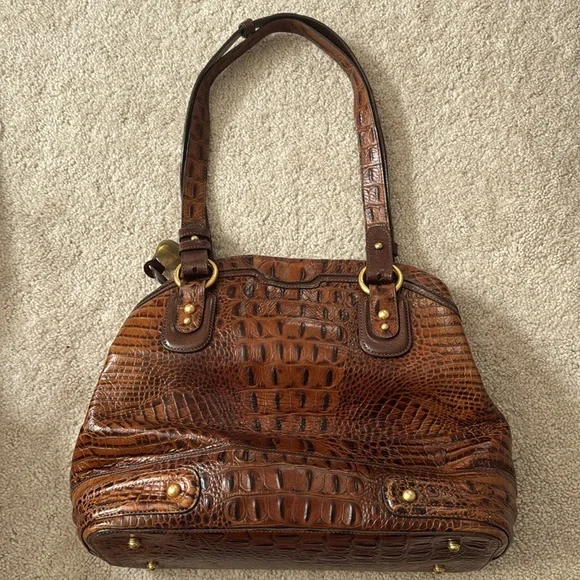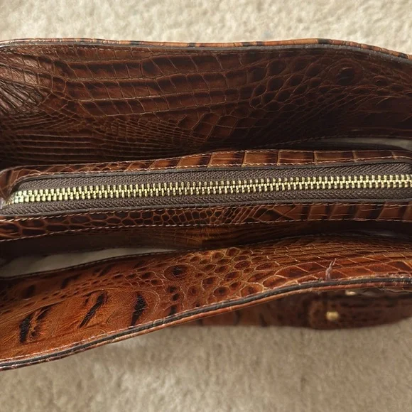 Brahmin shoulder bag features a rich brown crocodile-embossed leather with a glossy finish with matching wallet. Inside there are 2 magnets and one large middle zipper connecting...