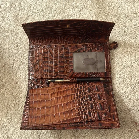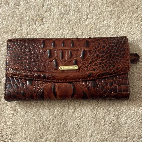 Brahmin shoulder bag features a rich brown crocodile-embossed leather with a glossy finish with matching wallet. Inside there are 2 magnets and one large middle zipper connecting both sides of this purse.
