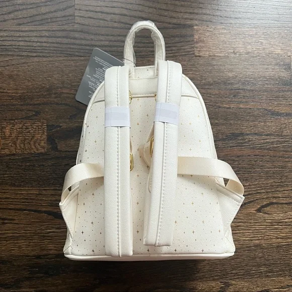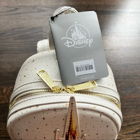 NWT Loungefly Cinderella Castle Mini Backpack Walt Disney World 50th AnniversaryFeatures:- Cinderella Castle appliqué with ´´50´´ logo- Golden pixie dust and quilting- Pearlized accents- Double zipper main compartment- Loungefly logo metal pulls- Adjustable padded shoulder straps- Top carry handle- Lined- Golden finish hardware- Disney Parks X Loungefly logo label plate on side- Part of the Walt Disney World 50th Anniversary Castle Collection- Material: 85% polyurethane / 15% PVC- Size: Approx. 10 1/2´´ H x 9 1/4´´ W x 4 1/2´´ DBrand new with tags, never used, excellent condition