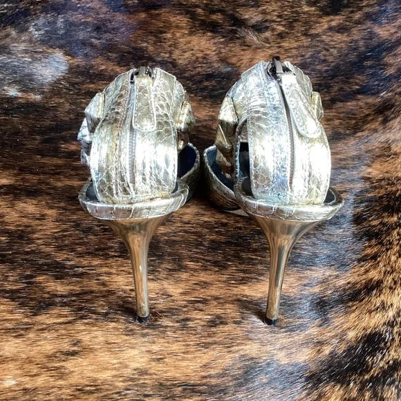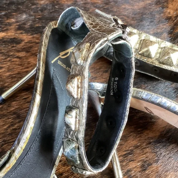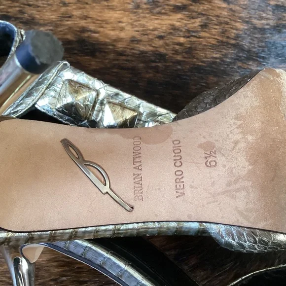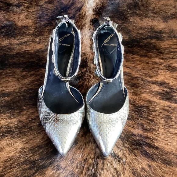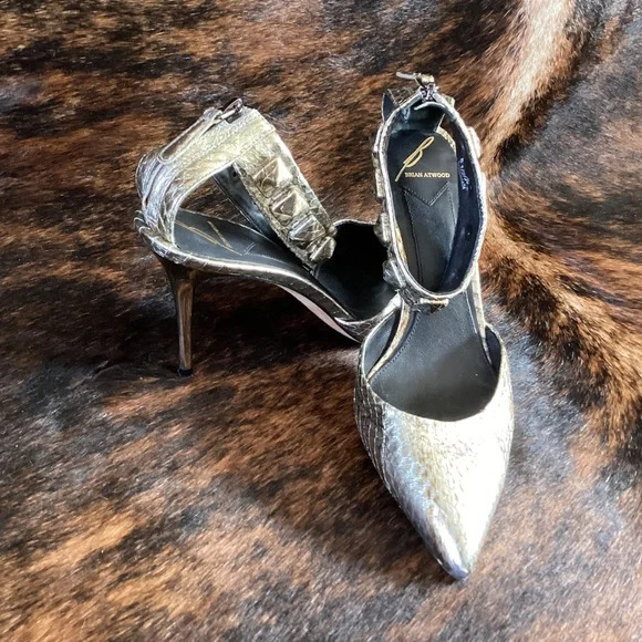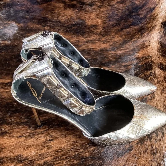 Super beautiful pair of Brian Atwood metallic snakeskin design pointy toe heels with an ankle wrap design zip back. This is a classy and exceptionally well made pair of sexy and classy heels! They just feel good to touch. Good used condition. Small thin mid height heel. You wear these heels and you will feel like a million bucks! Size 6.5
