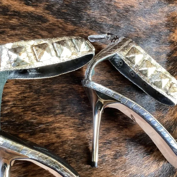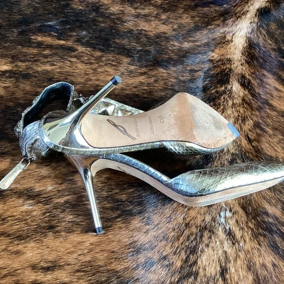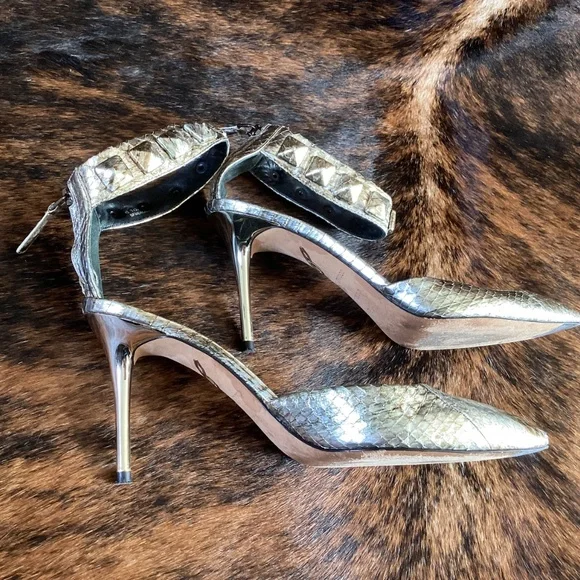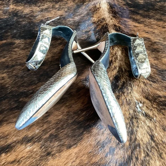 Brian Atwood Mercada Metallic Leather Snakeskin Pointy Toe Ankle Strap Heels