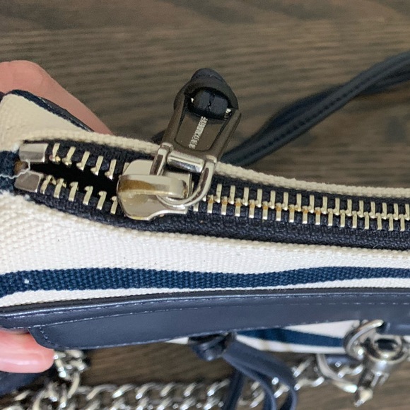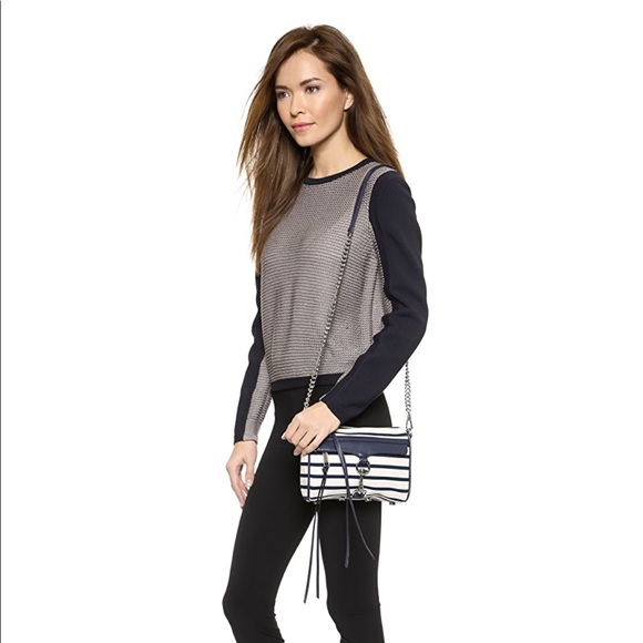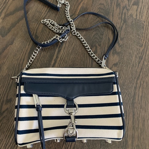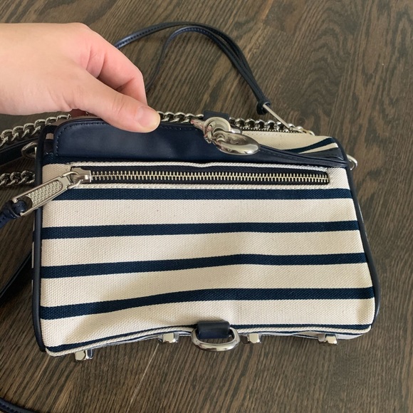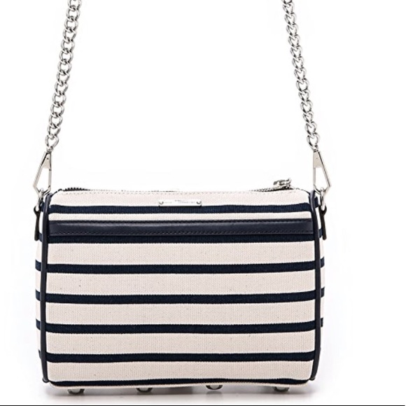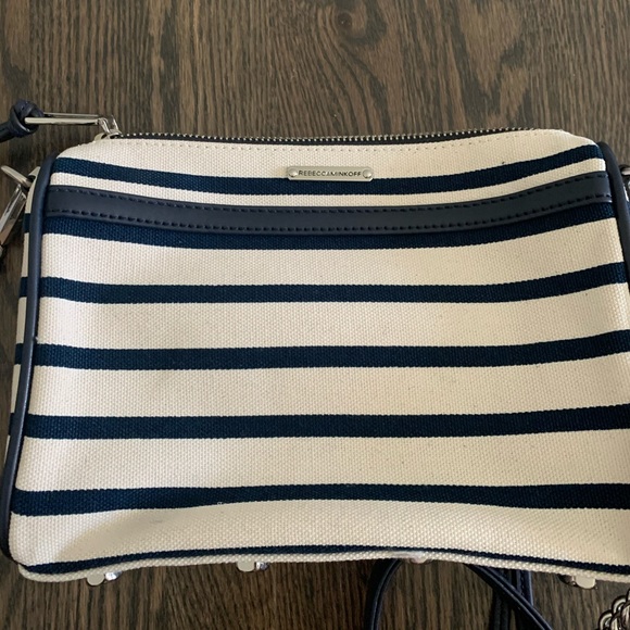 DETAILSA cross-body Rebecca Minkoff classic, styled in striped canvas with leather trims. This petite bag is detailed with polished hardware at the front pocket., and the zip top opens to a lined interior with one pocket. Dust bag included. Fabric: Canvas. Weight: 21oz. MeasurementsHeight: 6in Length: 9in Depth: 2in Strap drop: 22inColor: Navy & White StripeCondition: new without tags - slight tarnish on the zipper (see photos) but otherwise no flaws