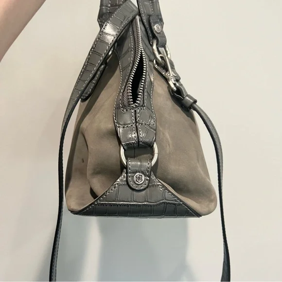 J.W Hulme gray croc embossed leather and gray nubuck top handle satchel purse with adjustable shoulder strap and inside pockets. Very gently used. Two small marks on exterior, see...