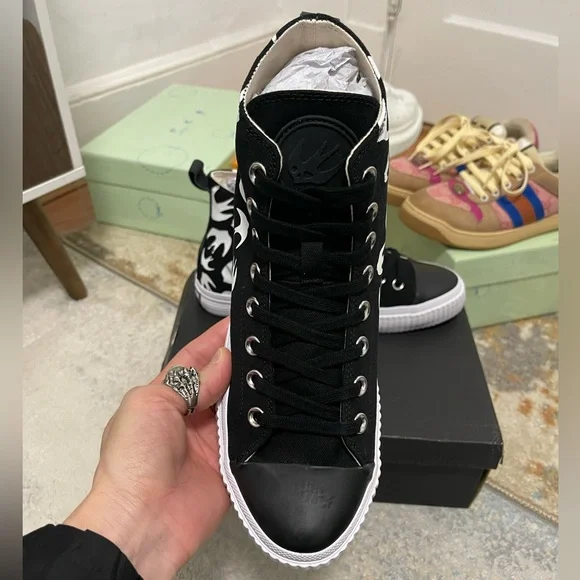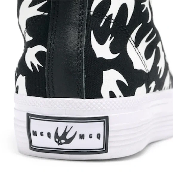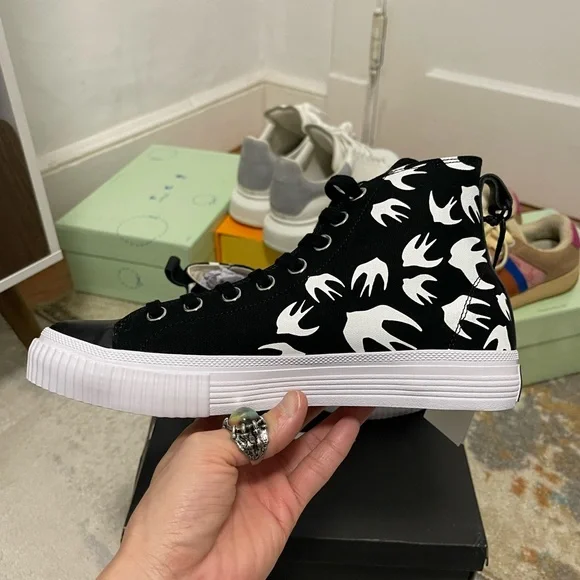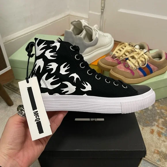 Brand new with original box and wrapping.Also come with MCQ’s certificate and care instruction card.Imported, designed in UK, made in PRC.Made with canvas with heavy-dusty rubber outsoles.Super comfortable and fashionable.Highlights are the swallow prints all over.High-top, lace-up, unisex.US men’s size 7, US women’s size 10, European size 40, 26cm insole length.Retail price was $300 before tax.Fast shipping.