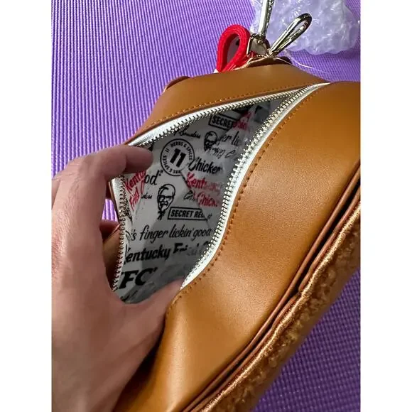 KFC Drumstick Bag Limited Edition NEW Loungefly Crossbody Bag Features: Faux leather (polyurethane), sherpa material, adjustable crossbody strap, enamel charm, applique, embroidered, and printed details, coordinating interior lining.Dimensions: 11" W x 5.25" H x 3.5" D (27.9 cm W x 13.3 cm H x 8.8 cm D).This is an officially licensed KFC product.To keep all of my items authentic, I do not accept returns of any kind. Packed carefully and shipped quickly. Please see photos for details and let me know if you have any questions. All my items come from a clean smoke free house. o
