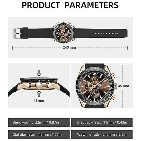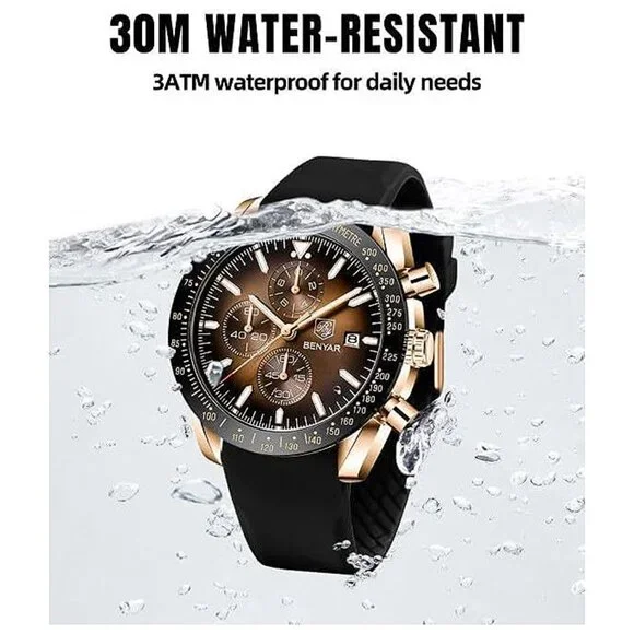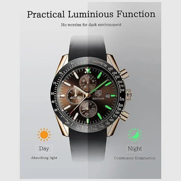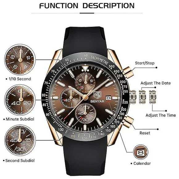 * UNIQUE ELEGANT DESIGN:This is a stylish and classic design man watch. 45MM beautiful and exquisite big face with three functional subdials and date display, tachymeter numerals on the bezel, with a fashion brown leather strap, Quality quartz analog movement and battery, provide precise time and perfectly match any of your outfits, Benyar analog wrist watch embodies the pursuit of fashion and quality that redefines time * QUALITY & COMFORTABLE:100% high quality imported quartz movement to provide high stability and accurate timing. 304 steel case with mineral glass, which greatly improves the wear resistance and scratch resistance. The brown leather strap watch for men not only looks elegant and stylish, but is also comfortable and soft to wear. This men´s wrist watches will stand the test of style and last a lifetime if properly maintained * CHRONOGRAPH & WATERPROOF:Multifunctional sub-dial can be used as timers (Second, Minute and Hour Chronographs). BENYAR´s waterproof chronograph watches for men is waterproof 30M/3ATM, can withstand sweat, accidental rain or water splash (Showering, swimming, immersion in water is not recommended). After absorbing enough light energy to have a certain glow-in-the-dark effect in dark environments. It is a multifunctional leather watches for men * EXQUISITE GIFT: Fashion and casual watches suitable for men and youth, perfect for everyday wear and any occasion, Providing accurate timekeeping and becomes a fashion statement for your vers