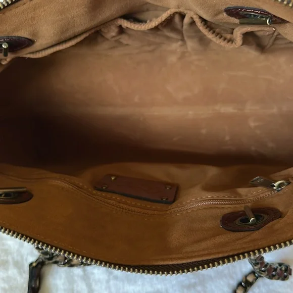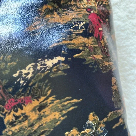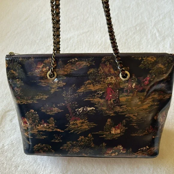 This elegant shoulder bag features a sophisticated design with chain straps that feature interwoven coordinating leather, perfect for any occasion. The navy and brown color scheme adds a touch of classic style, while the structured shape ensures durability and functionality. Beautiful horses, riders and hunting hounds in a country setting adorn this gorgeous tote. Tote is new with the tag attached. In beautiful, unused condition from a smoke-free home. Slight rub shown in closeup photo. Comes with dust bag and interior card. Thank you for viewing my listing! Please comment if you have any questions or would like more information.