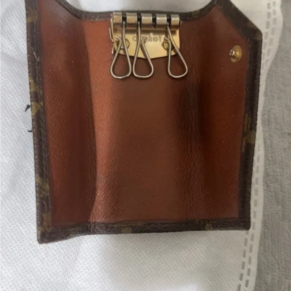 Stylish Louis Vuitton key holder with iconic monogram design. Features brown and tan colors.Missing one hook