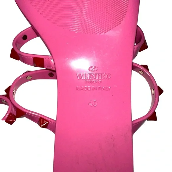 Experience the perfect blend of style and comfort with these Valentino Garavani pink sandals. Crafted with a chic design, they offer a vibrant pop of color to elevate any ensemble. Ideal for casual outings, these sandals ensure you step out in confidence and flair.NOTE: Some color transfer, as seen in pictures Size: 40 (US 9.5)Color: PinkMaterial: PVC