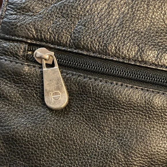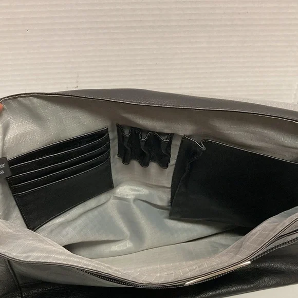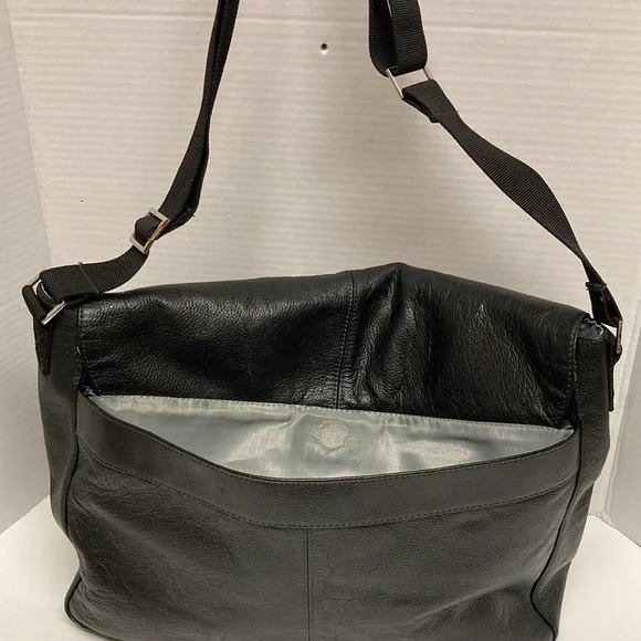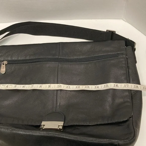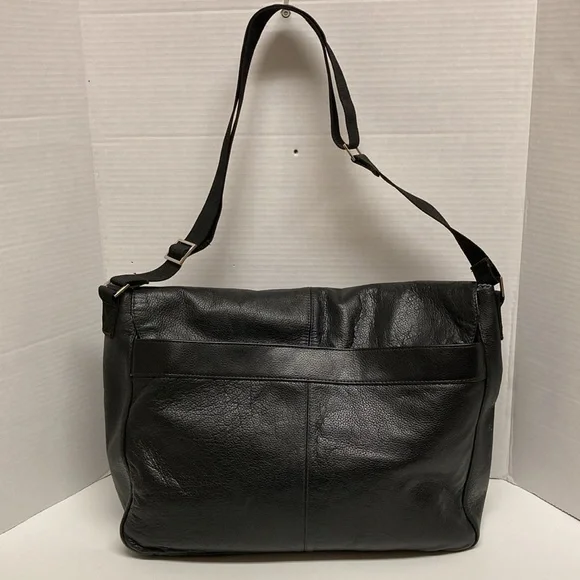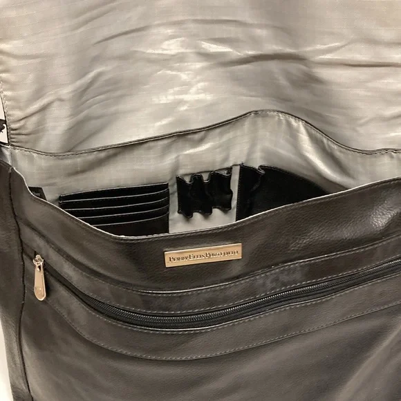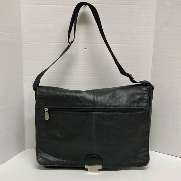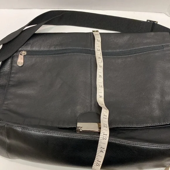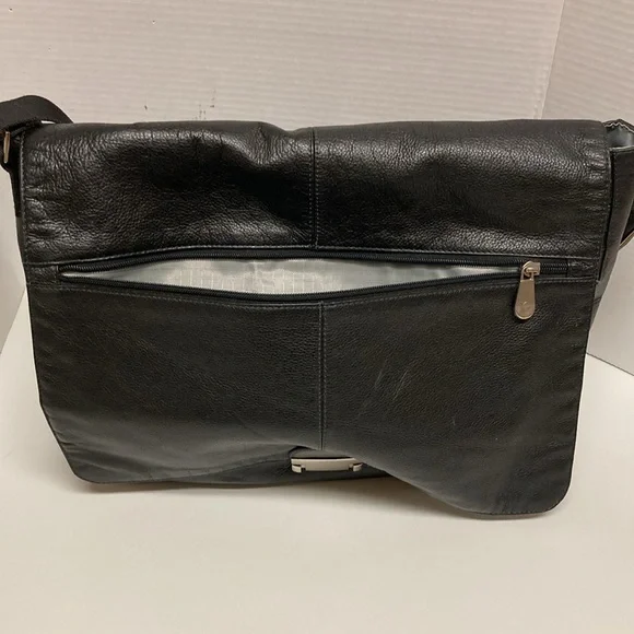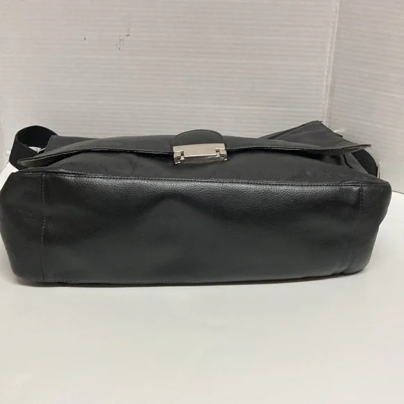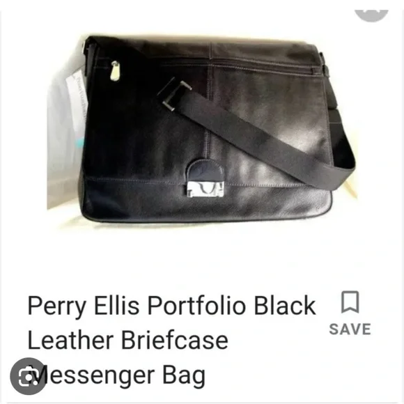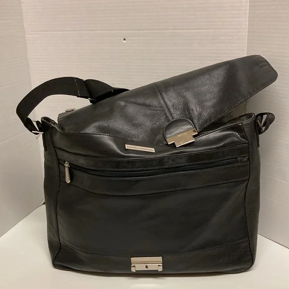 PERRY ELLIS Portfolio Black Leather Briefcase Messenger Bag ,Lap Top BagUNISEX SIZE OSColor Black Bag has adjustable strap,has four cards holders,three ink pens holders,one large Pocket,on the inside ,has a flap over with a zipper on it has large zipper compartment on front of bag,closure with double clasp,,has large pocket on back with magnetic closure SEE PICTURES for more Details Used a couple of Times EXCELLENT USED CONDITION