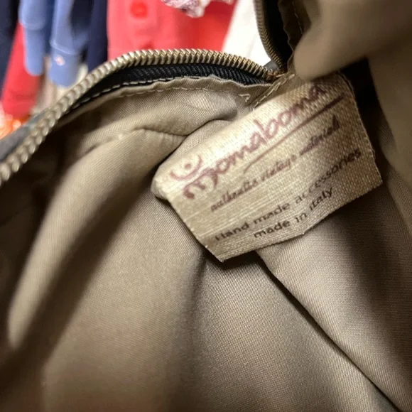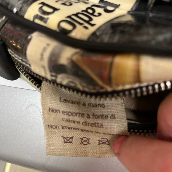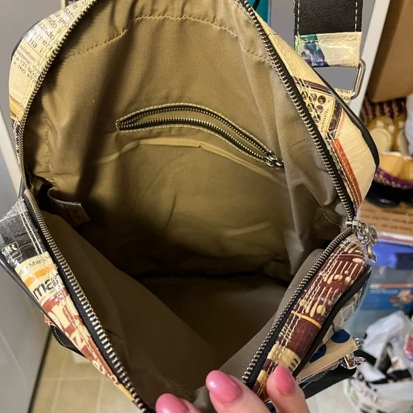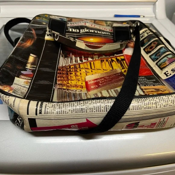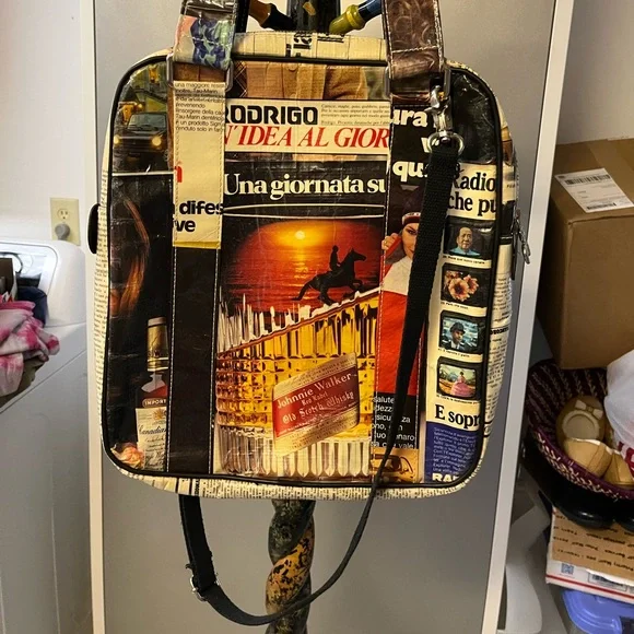 The gorgeous momaboma bag can be carried as a satchel (zippered top closure) , backpack, or a crossbody with its removable nylon strap. It is made from Italian newsprint treated with resin, polypropylene and vinyl. It has a zippered outer pocket. It is handmade in Italy. The interior has a fabric lining with a zipper pocket. Measures approximately 13” high 12” wide with a base width of 3 1/4”. Excellent condition.