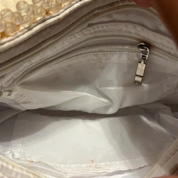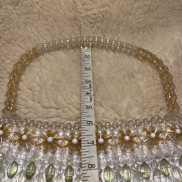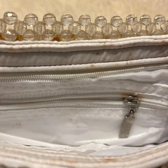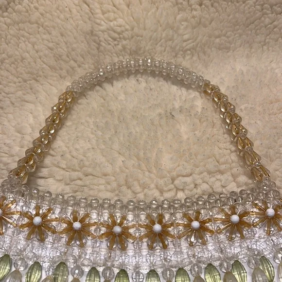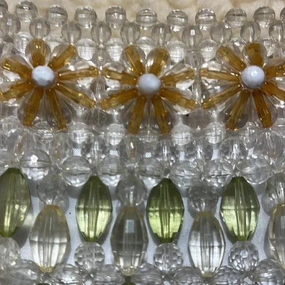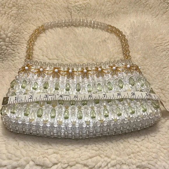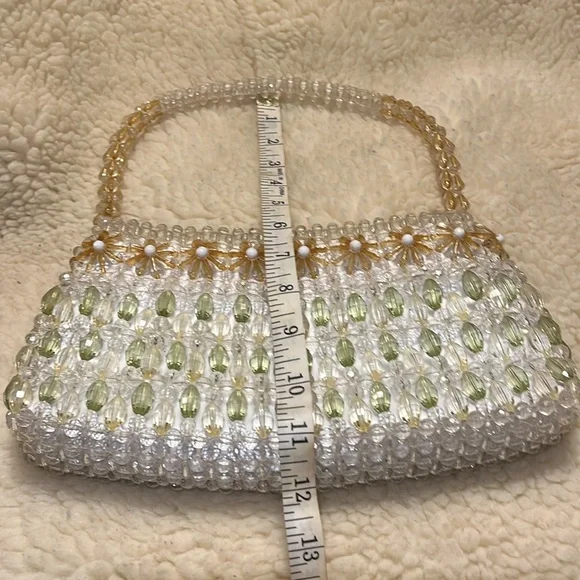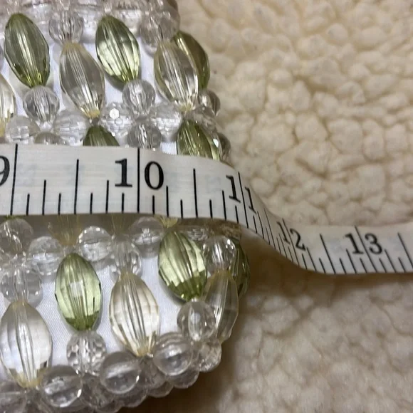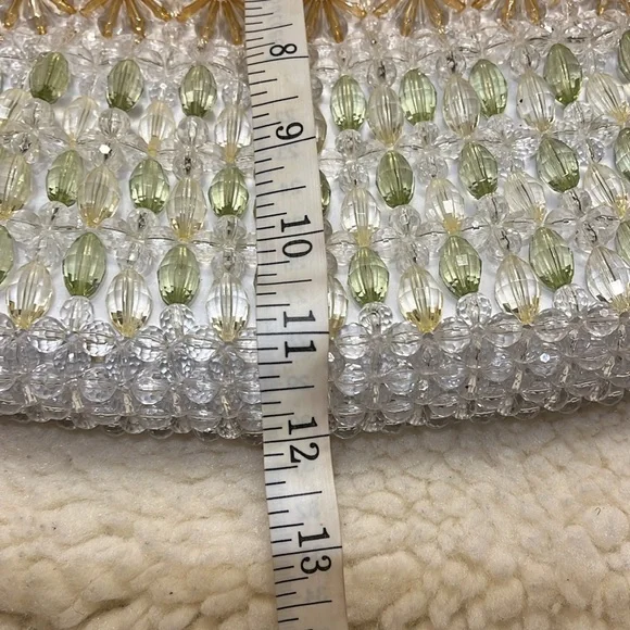 This elegant beaded handbag features a stunning combination of clear, gold, and green beads. Perfect for adding a touch of sophistication to any outfit. Dark areas on the inside, see last pic.