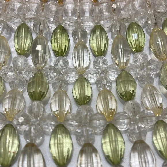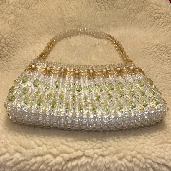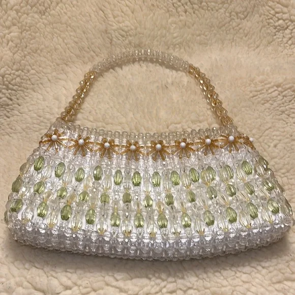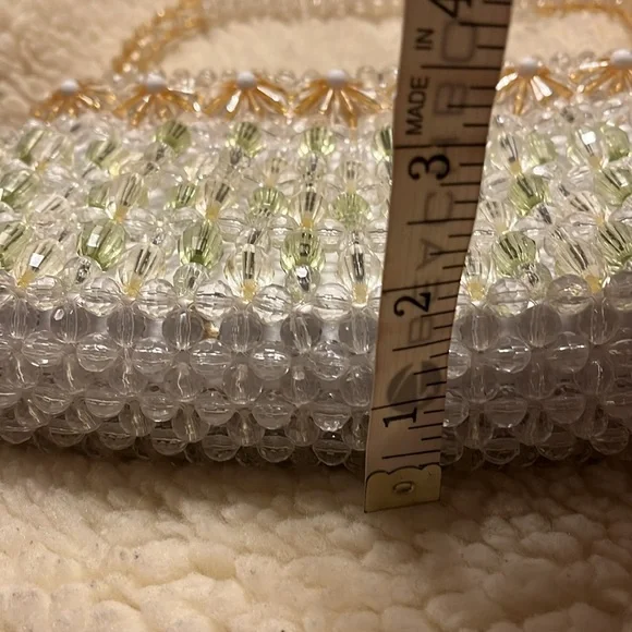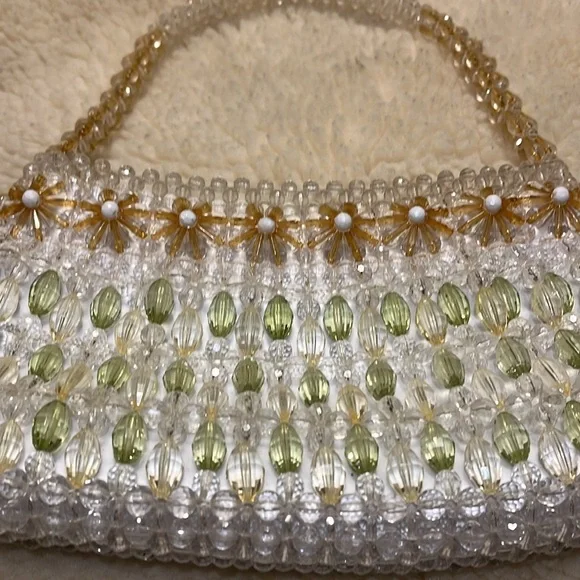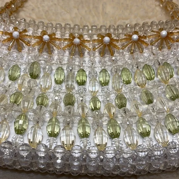This elegant beaded handbag features a stunning combination of clear, gold, and green beads. Perfect for adding a touch of sophistication to any outfit. Dark areas on the inside,...