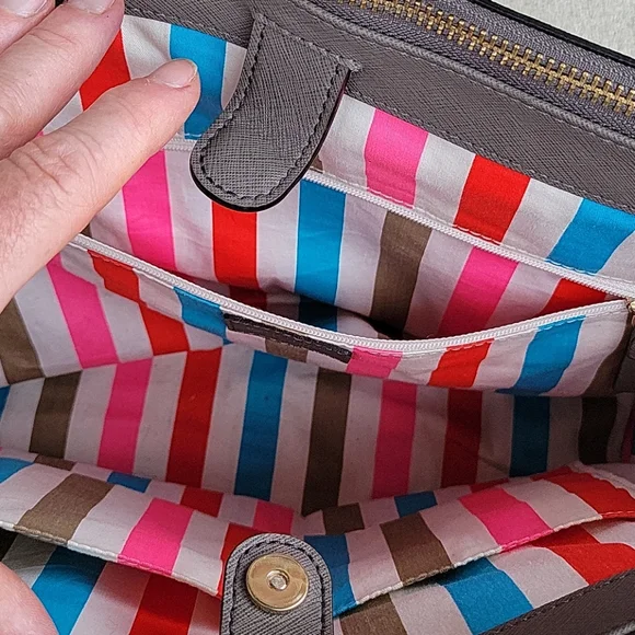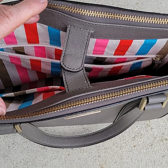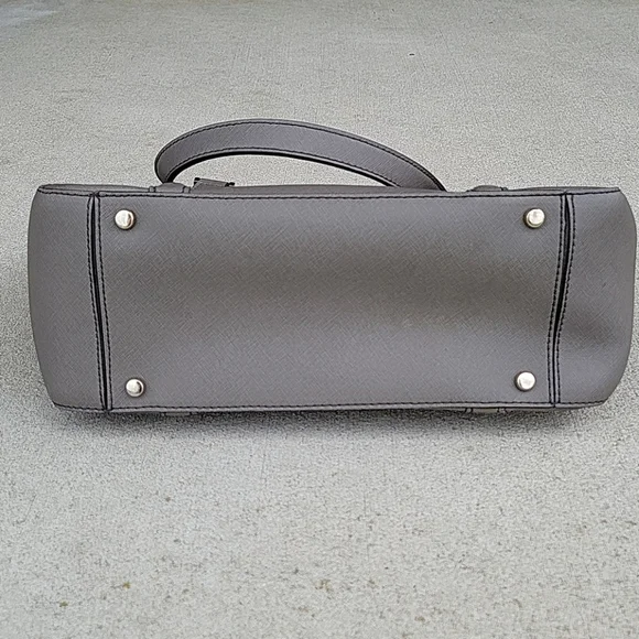 Color is hard to find "Cliffgrey", Saffiano Leather. Excellent condition, I only carried a couple of times.It is too big for my liking and has been sitting in my closet.Dual shoulder straps, 1 zipper pocket and 2 multi function pockets, multi color twill lining, zip and snap closure at top, protective feet at base.14 kt light gold plated hardware.Some light scratches on feet.Shoulder strap drop 7", height 9.5", width 11.5" at base, depth 4.5".