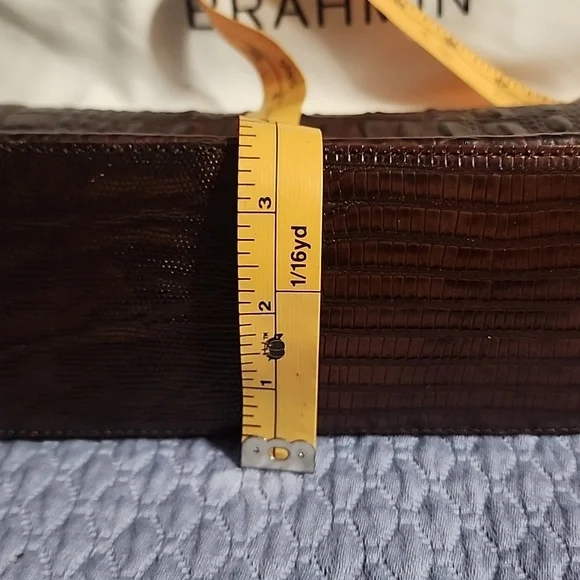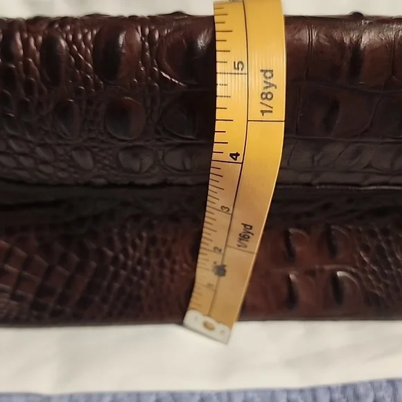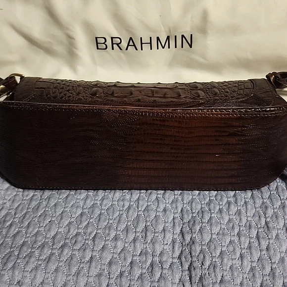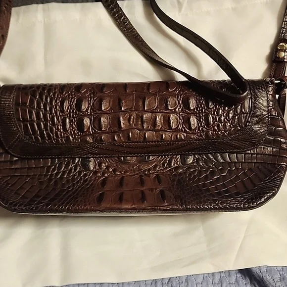 This stylish brown bag features a sophisticated crocodile-embossed design. Perfect for adding a touch of elegance to any outfit. It stays closed with a magnet. Used a time or two.Brahmin dust bag included.