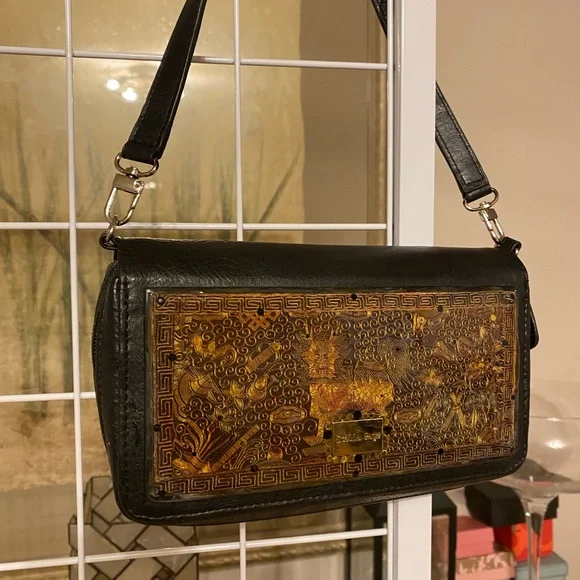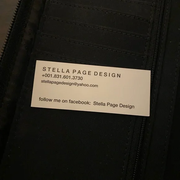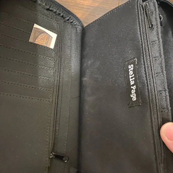 Stella Page black handbag/wristlet Epoxy lacquer mural on front Zipper closure, lots of storage for ID cards, credit cards, etc., and zipper compartment Some scratches on the lacquer mural They are difficult to see Smoke free home  reasonable offers accepted