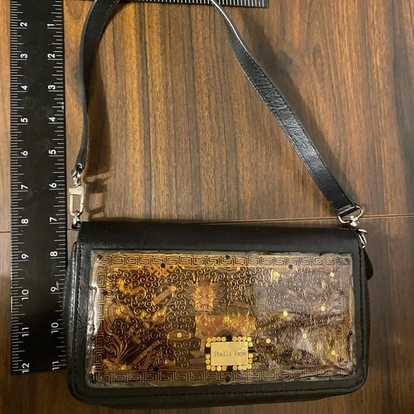 Stella Page black handbag/wristlet Epoxy lacquer mural on front Zipper closure, lots of storage for ID cards, credit cards, etc., and zipper compartment Some scratches on...