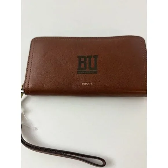 Brand: FossilImported12 credit card slotsDebossed graphicsDetachable wristlet strap measures approx. 5´´Double stitch detailsMeasures approx. 7.75´´ x 0.75´´ x 4´´One zipper pocketRFID-Blocking technology blocks electronic pickpocketing and RFID skimmingThree Gusseted pocketsTwo bill compartmentsZip clutch covers all your storage needsMaterial: 100% LeatherOfficially licensed This classy Fossil gear is just what you need to add a touch of Boston University pride to your everyday life. Debossed Boston University graphics on this Leather Logan RFID Zip Around Clutch flaunt your die-hard fandom while the RFID-blocking technology protects you from electronic pickpocketing. It also features multiple bill compartments, pockets, and several credit card slots to provide ample space for your necessities.