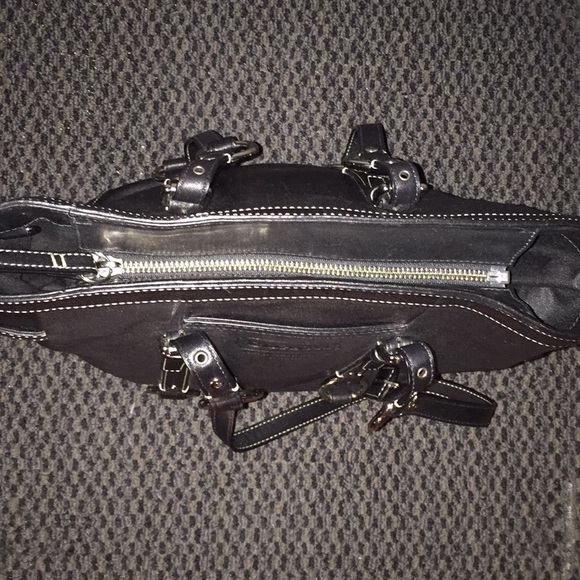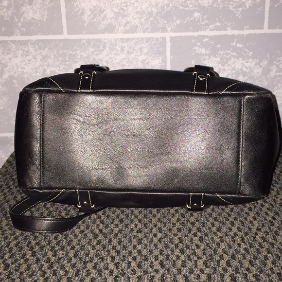 Black leather tote purse with small front pocket, side pockets with clasp, interior zipper pocket. Bag can zip close or zipper can unfasten for easier access to interior....