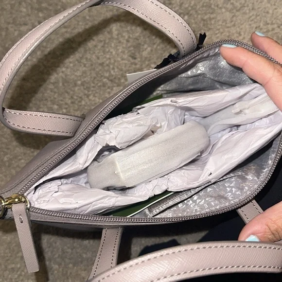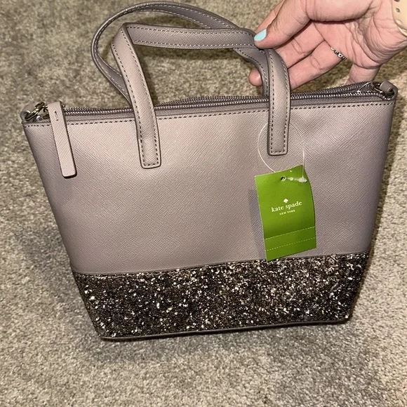 New with tags. Taupe/ grey color with sparkles around. Super cute and good size bag. Crossbody strap included in the bag as well.