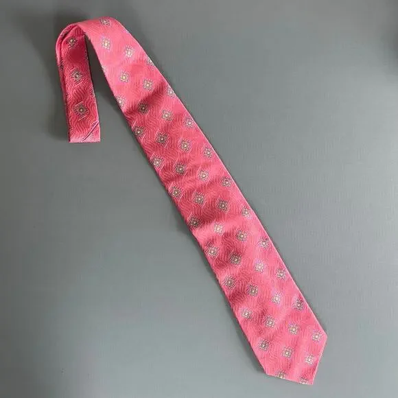 This tie has a beautiful metallic sheen.A salmon pink color with other pastelsIn excellent like new condition60" long3.75" wideShop with confidence. As a former professional...