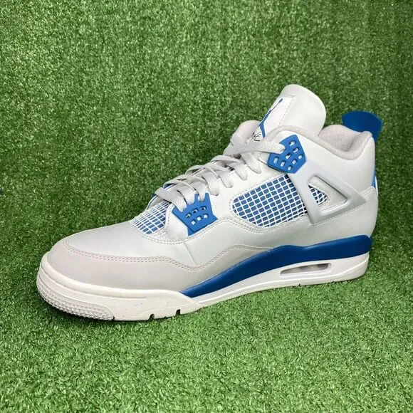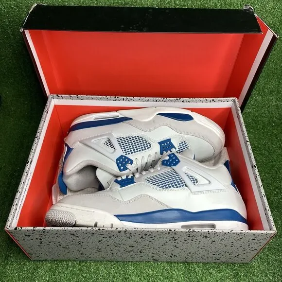 Elevate your sneaker game with these Air Jordan 4 Retro 2023 sneakers in Military Blue colorway. Featuring a high-top shoe shaft style and lace-up closure, these sneakers are designed for comfort and performance. The rubber outsole material provides durability, making them suitable for boxing, basketball, and bodybuilding activities.Crafted with leather upper material and foam insole material, these sneakers are cushioned for added comfort. The off-white/military blue/neutral grey color scheme is a classic and retro theme that will never go out of style. These sneakers come in their original box and are perfect for men who want to add a touch of elegance to their shoe collection.