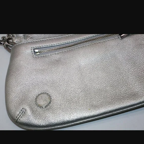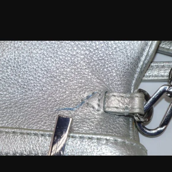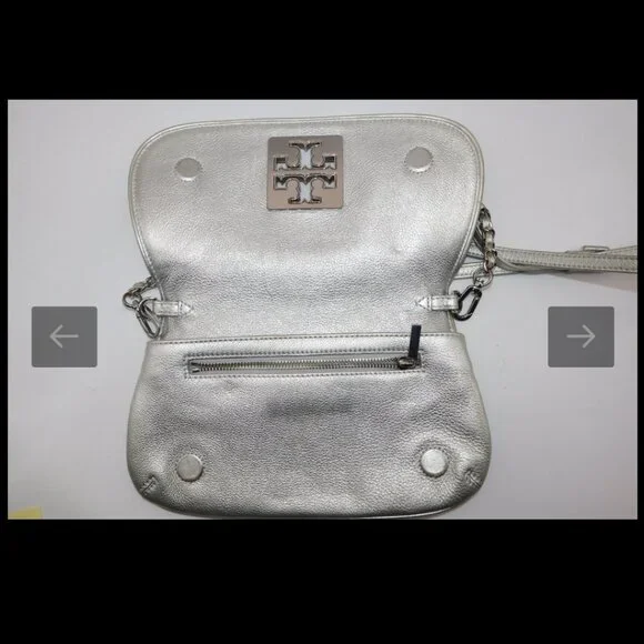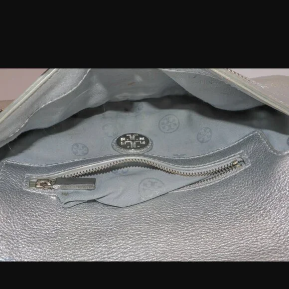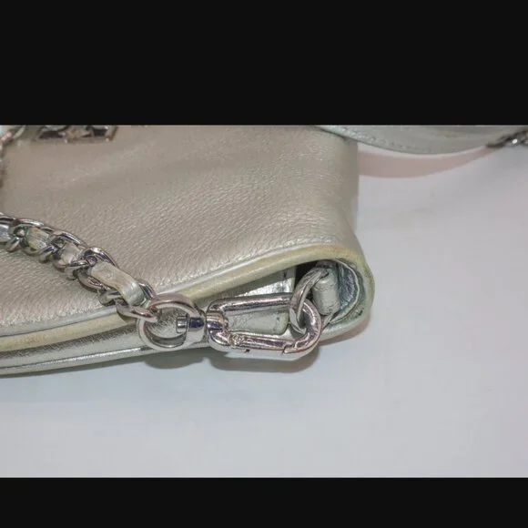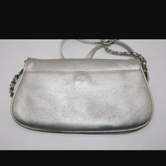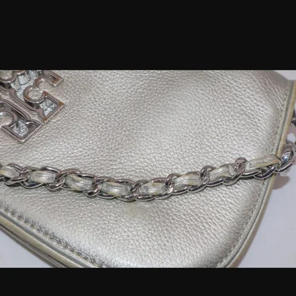 Tory Burch Silver Metallic Chain Crossbody Purse Handbag11.5" x 6"Has some yellowing and a pen mark on exterior. Please see all photos.