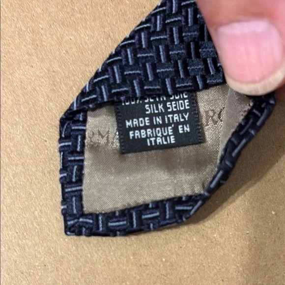 This Giorgio Armani tie, crafted in luxurious black silk, features a sophisticated geometric pattern that adds a touch of elegance to any formal ensemble. Its classic design and high-quality material make it a timeless accessory for business or formal occasions. 100% silk made