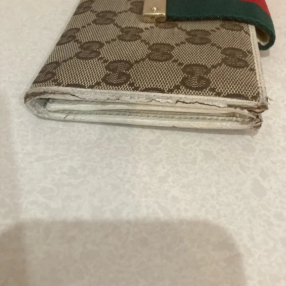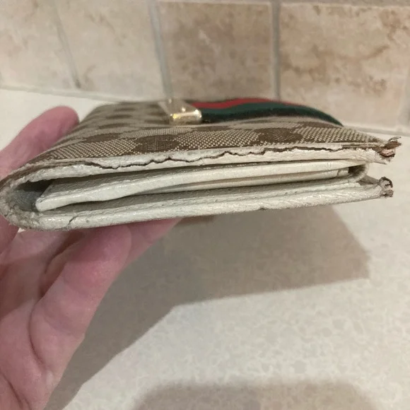 This is a vintage wallet with some obvious callouts, but it has great bones attractive snap works. There’s some frame in a couple of the corners as shown and some peeling on one edge. The inside has a little yellowing, but the pockets are clean and the coin pocket is pretty cleansnap to work just needs a little TLC rehabbing wouldn’t take much. I don’t know how.