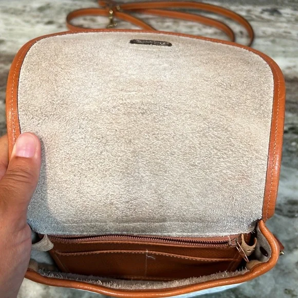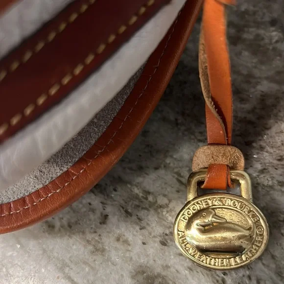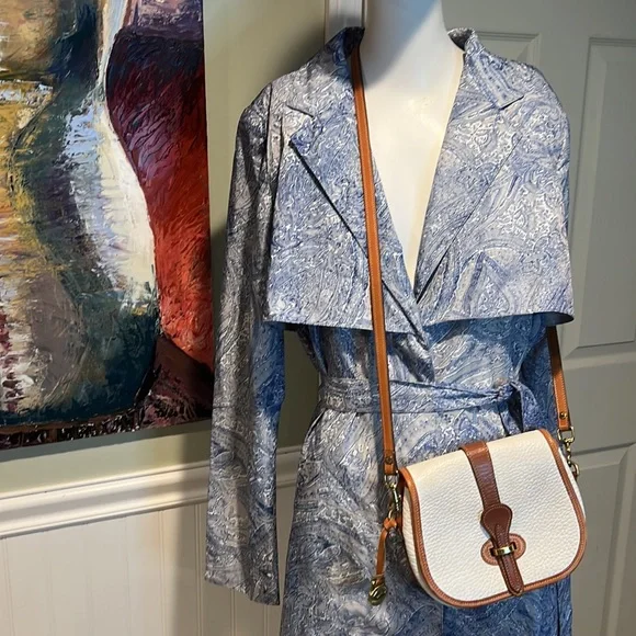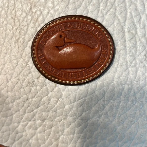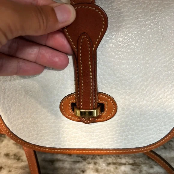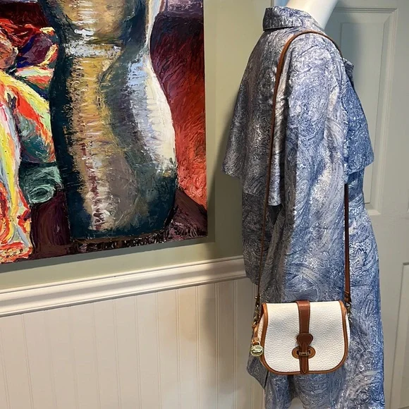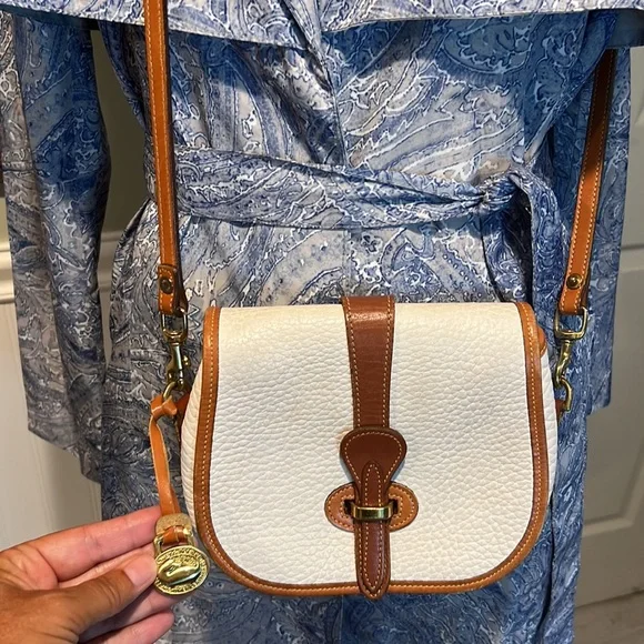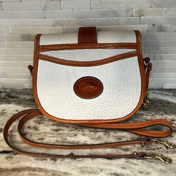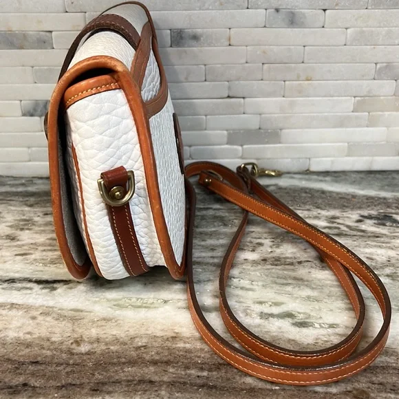 Vintage 90s Dooney & Bourke White Pebbled All Weather Leather Crossbody Saddle BagAn iconic bag for D&B with an equestrian vibe. This is the ORIGINAL design created in the 80s. The modern version is almost identical.80s Treasure for the D&B CollectorVintage Dooney & Bourke White Pebbled All Weather Leather Crossbody Saddle Bag, Contrasting British Tan Vachetta Leather Trim- as it ages it develops a honey color.Features: Flap Style with Brass Hardware, Attached Brass Duck Fob. Inside is unfinished, One zippered pouch and 2 slots, detachable strapApproximate Measurements: Height: 7.5" Width:10" Depth: 3.5" Strap Drop: 22”In excellent vintage condition! Very light signs of wear. Please see all photos- as they tell the story.