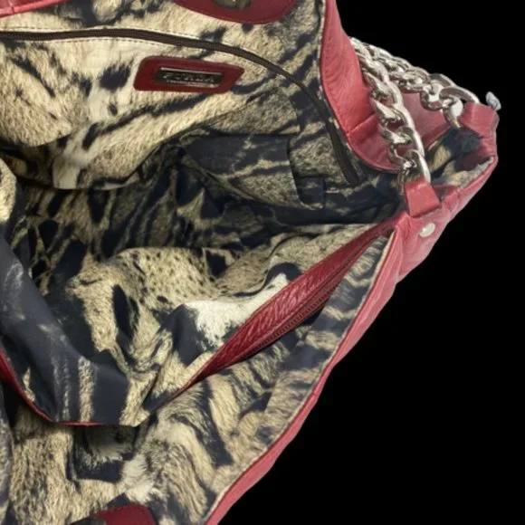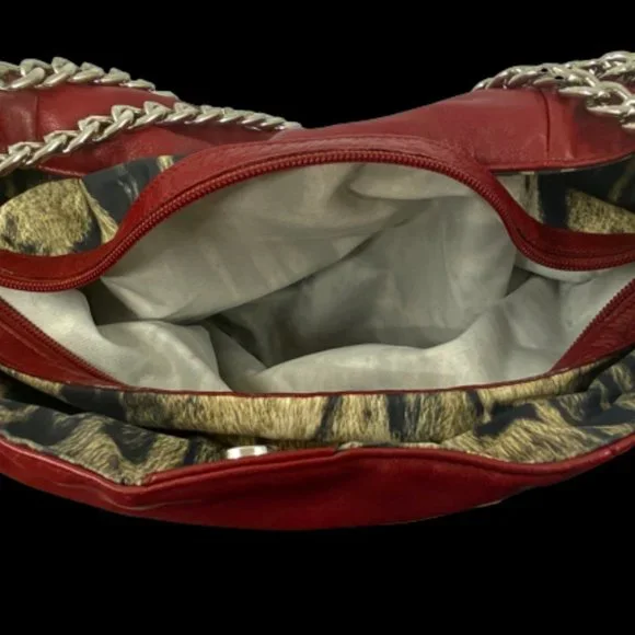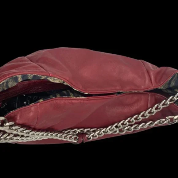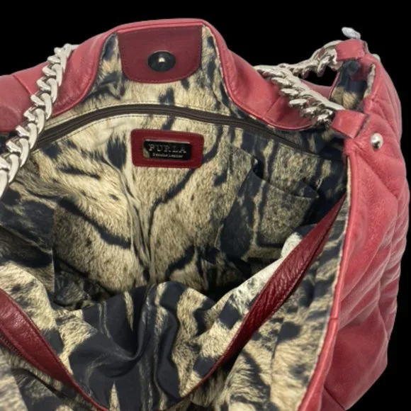 Furla Hobo Bag - Authentic Color: Deep Red /MaroonExcellent pre-owned condition with no visible signs of wear.Smooth leatherMagnetic closure3 large interior compartments (2 open and 1 large zipper)Interior small zipper pocket and slip pocketLimited edition animal print interior fabric liningChain strap (silver) and attached Furla metal charm that includes pull out mirrorApproximate dimensions:16"W x 13"H X 8"D with 11" chain dropStyle: 674496$398 rv