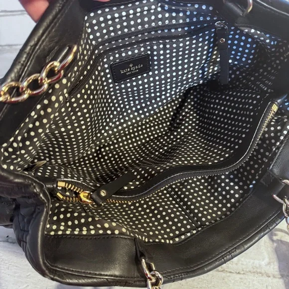 Kate Spade Astor Court Elena Black Quilted Leather Shoulder Bag Twist Lock PurseThis elegant Kate Spade Astor Court Elena shoulder bag is the perfect fashion accessory for any occasion. With a stylish black quilted leather finish and gold-tone hardware, this bag exudes sophistication and class. Double handles with chain detailing In excellent pre-owned condition Very cleanOne depression mark on the bottom from closet that should work out with use Center zippered pocket with compartment on either sideYou turn the logo latch to openSome edge discoloration on the logo latchTop-Rated Seller | Same/Next Day Shipping | Offers Welcome