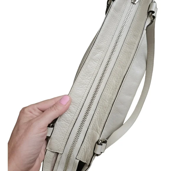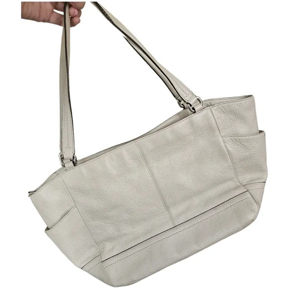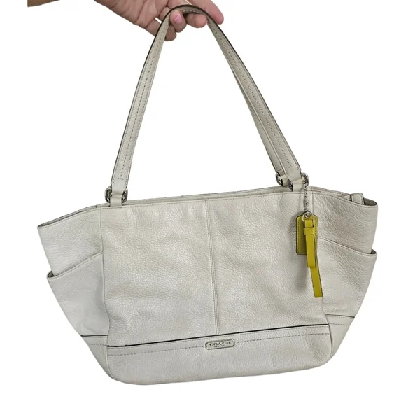 COACH PARK LEATHER CARRIE TOTE Style: F23284 Color: SV/PARCHMENT MSRP $358 Leather Inside zip, cell phone and multifunction pockets Zip-top closure, fabric lining Outside open pockets Handles with 8 3/4" drop Measures approximately 12"L x 10"H x 5 3/4"D Questions? Please post in comments. Thank you.