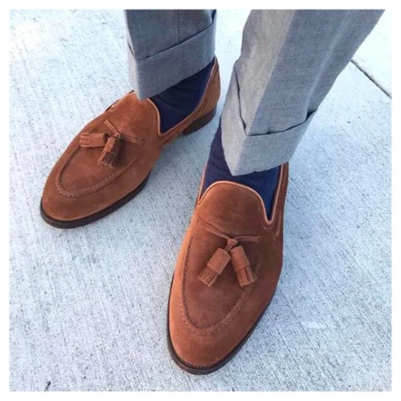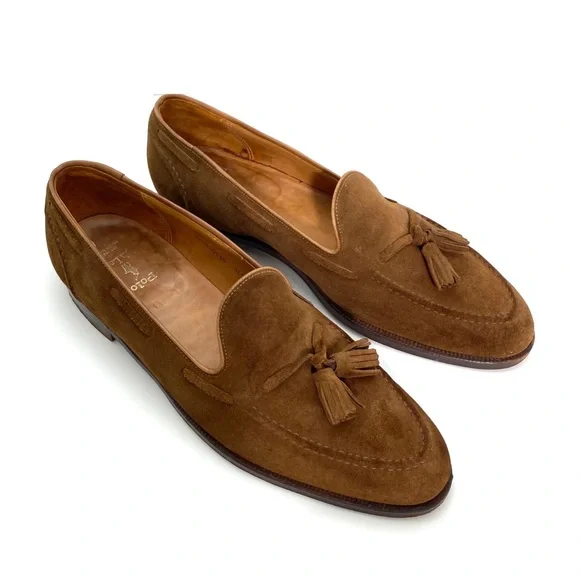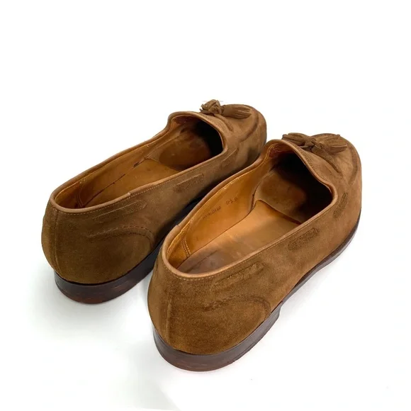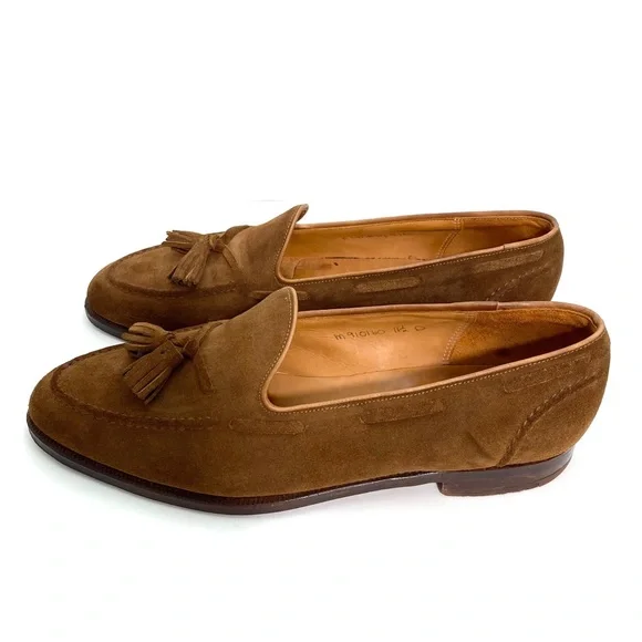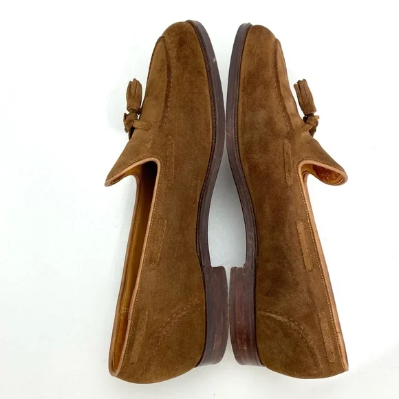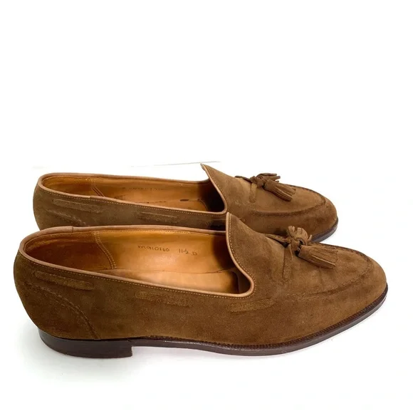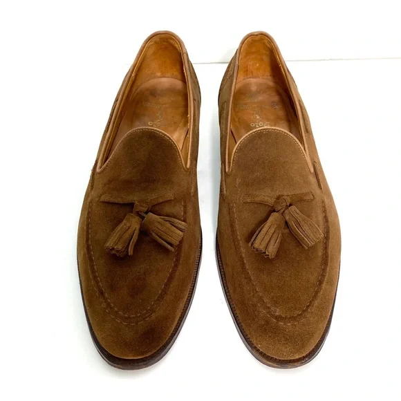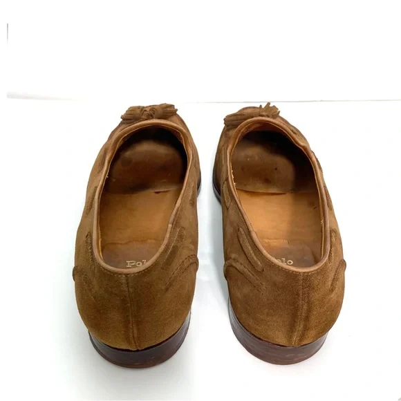 Polo Ralph Lauren Booth Suede Fringe Loafers in New Pale Russet / Camel TanSize 11.5Upper : Suede Leather Color : New Pale Russet / Camel Tan Brown 1"/25 mm heel height.Almond-shaped toe.Slip-on styling.Double-needle–stitched detail at the upper. Tasseled laces.Cork-filled insole forms to the foot.Leather outsole.Handmade in Spain, the Booth loafer celebrates traditional craftsmanship and refined style. Luxuriously soft suede is paired with a custom cork insole designed for comfort. With Goodyear welt construction, the Booth can be resoled by a skilled cobbler again and again for years of regular wear.Good Condition.
